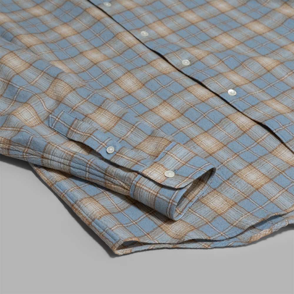 ふっくらと凹凸のある生地感と、淡い色調のチェック柄が合わさることで、落ち着いた印象にまとまっています。コートやジャケットのインナーとしても映えるシャツは3シーズン通して使い勝手の良い1着です。
