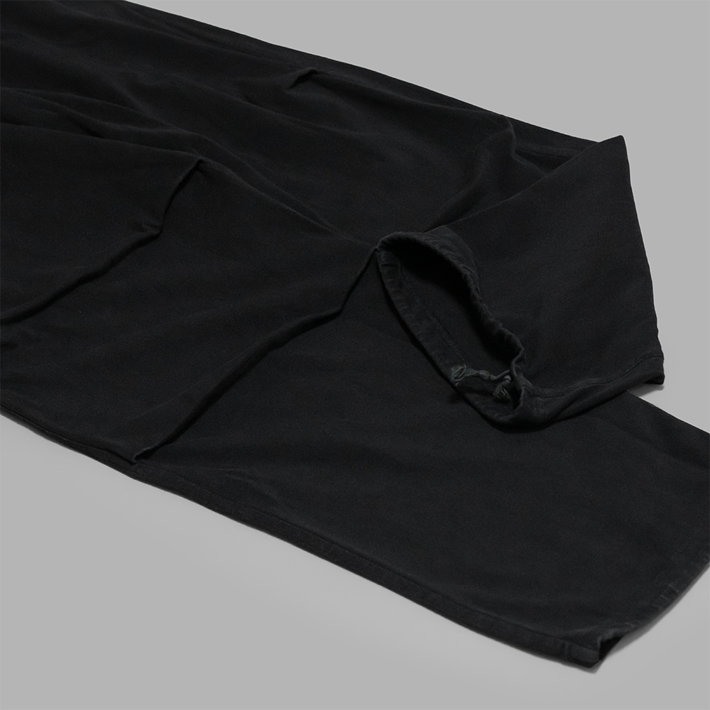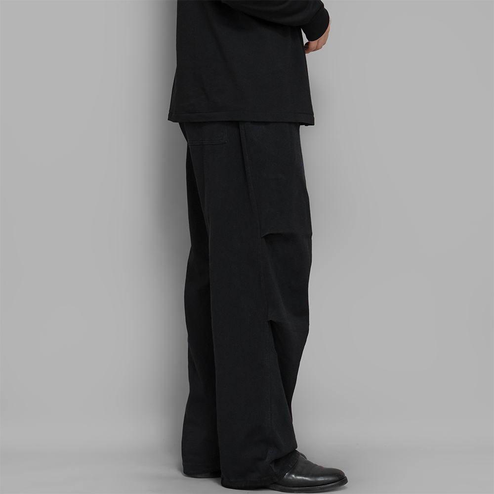 型は、膝のタックとゆったりしたシルエットが特徴のニータックパンツです。膝のタックが、立体感のあるシルエットと更なる運動量を生み出します。前立ての開きは無く、腰にゴムと紐を通しています。裾にも紐が通されており、絞ってリブパンツのような感覚で履くこともできます。