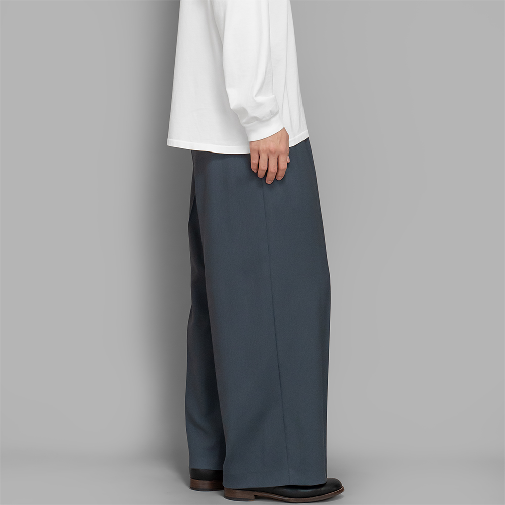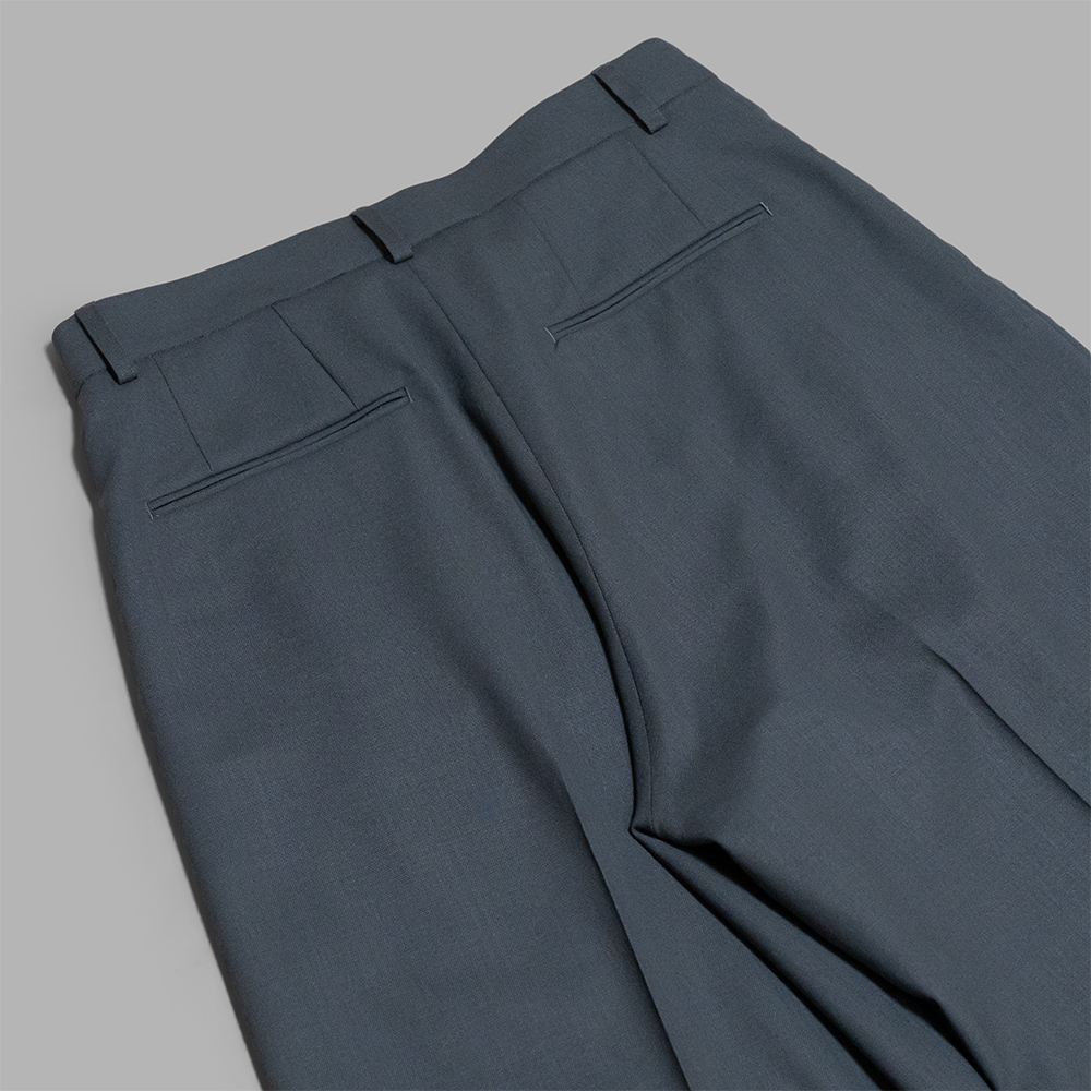 型は、ツータックのワイドストレートになります。タックが少し深めに入っているので、腰回りの動きやすさだけでなく、ワイドシルエットによるドレープがしっかりと出てくれ、ドレッシーな雰囲気とリラックス感のあるデザインです。また、「Blue Gray」の色合いは、洗練された落ち着きがあり、春夏の時期は清涼感を感じせ、秋冬の時期は、寒色特有の上品な雰囲気を併せ持っているのも特徴です。前立ては、トップがフックとボタン留めのジップフライで仕立てられています。