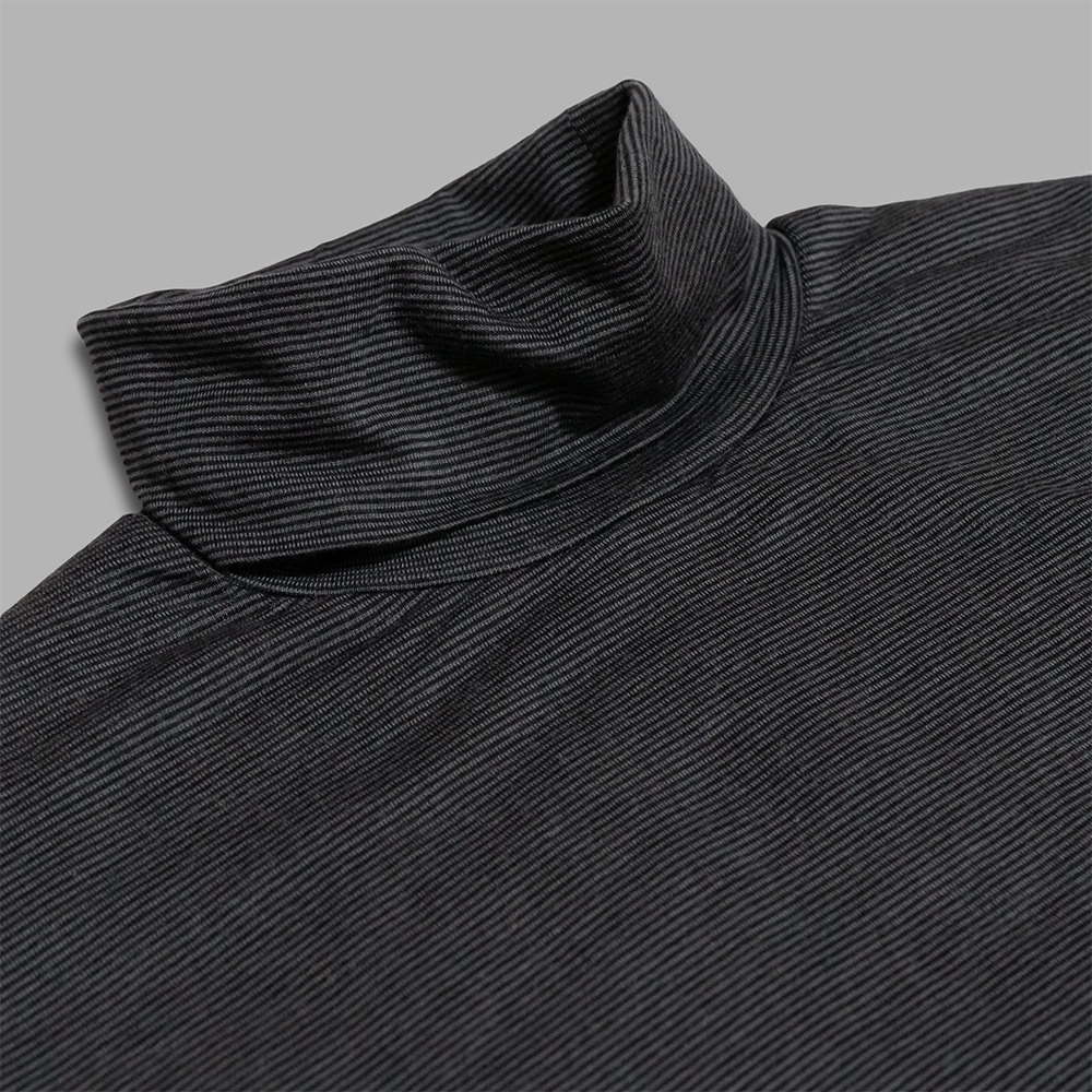 インナーとしての用途も踏まえ、ゆったりとしすぎないように適度なゆとりを持たせたサイズバランスでデザインされたタートルネックです。1枚だとやや透けを感じますが、スリーブ以外は生地を2重にすることで、透けの防止と保温性を持たせています。