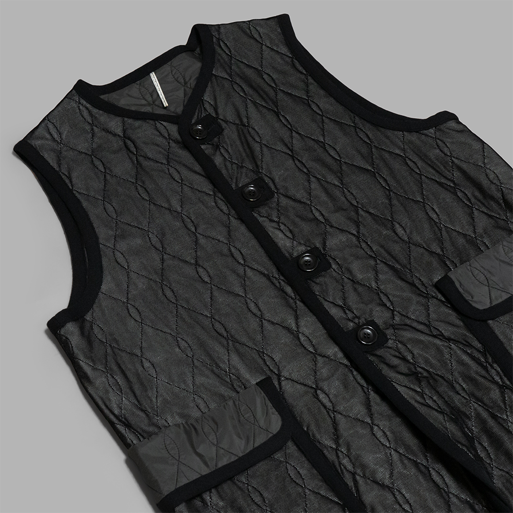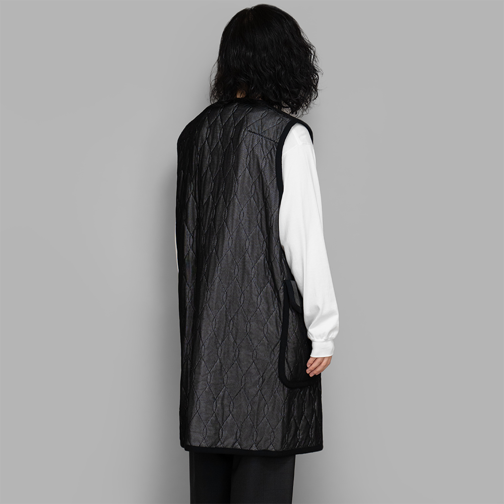 型は、シルク綿を使用したキルティング生地を最大に活かすことで開発された、新型のロングベストになります。裁断端はウール素材のテープを使用し、丁寧な見返しの縫製がされているので、装飾としてのデザインだけではなく、リバーシブルのアイテムとして裏面での着用も可能です。キルティング素材である裏面には、左右にポケットが一つずつ付きます。