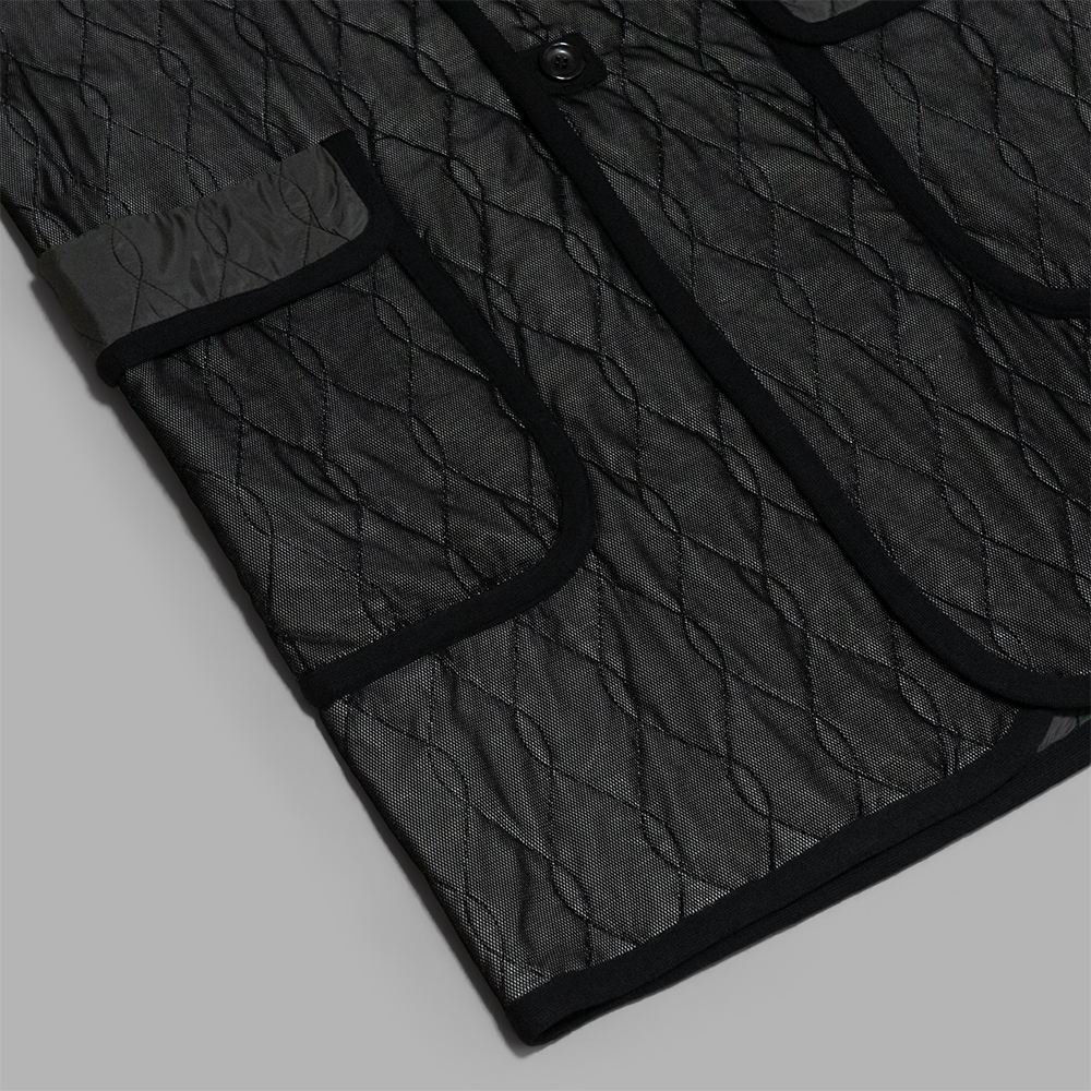 表面には、ポリエステルとナイロンを使用したメッシュ素材を使用しています。起毛したベロア調のメッシュ素材を使用しているため、メッシュ素材には奥行きが感じられ、メッシュ素材より覗くシルク綿には柔らかさが強調されます。そして、中綿には、シルク原料をそのままシート状に加工した「シルクロフト」という素材を使用しており、保温性・吸湿発熱性に加え、防風性にも優れています。天然由来の機能性を最大限に引き出した唯一無二の素材です。