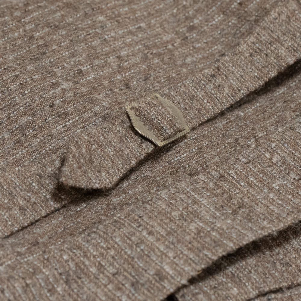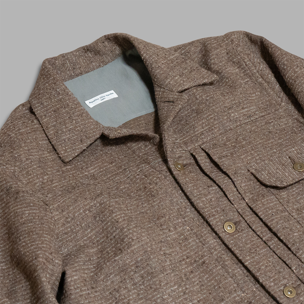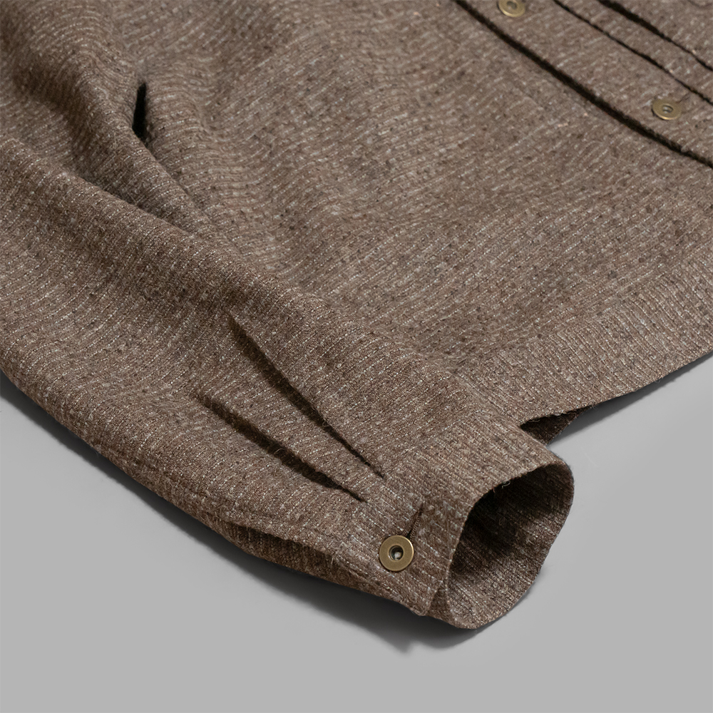 素材は、毛織物を中心とした日本最大の繊維産地としても知られる、尾州産のウールとアルパカの混紡生地を使用しています。補色のコントラストを生かしながらも、柄が出やすいピケ組織を採用し、彼の作品に度々描かれてきた畑の”畝”(土の盛り上がり部分)を、アルパカのループヤーンを配置しミルド仕上げで馴染ませることで、ふわふわとした質感と保温性、軽さなどの機能性だけではなく、畝の盛り上がりを実現させました。