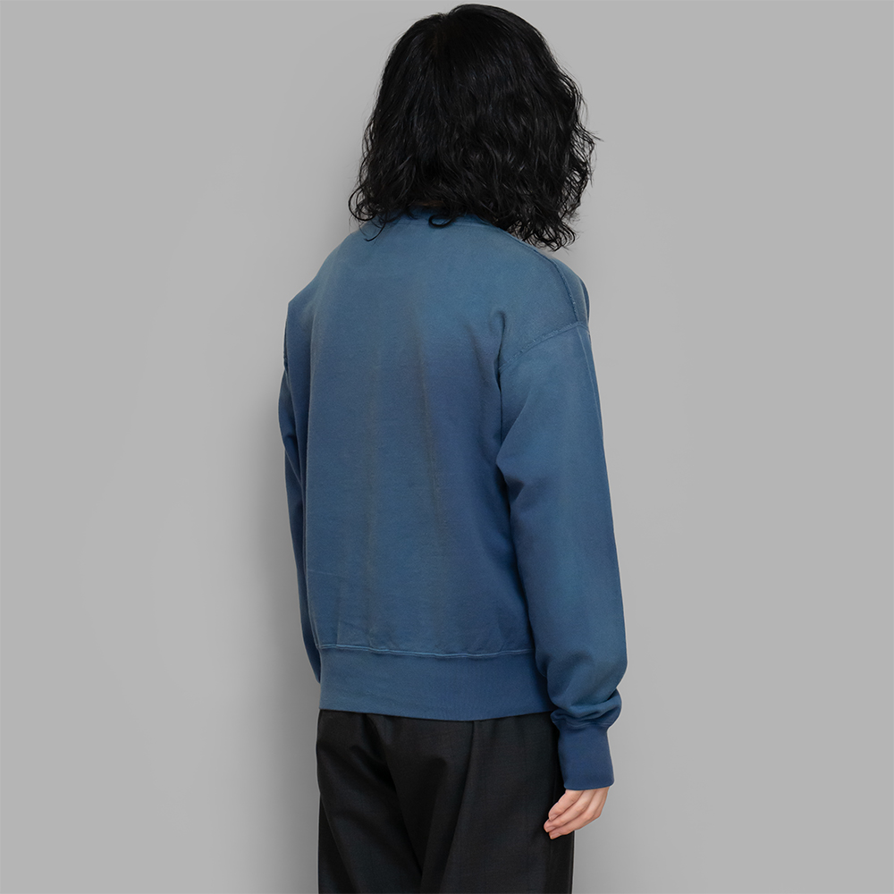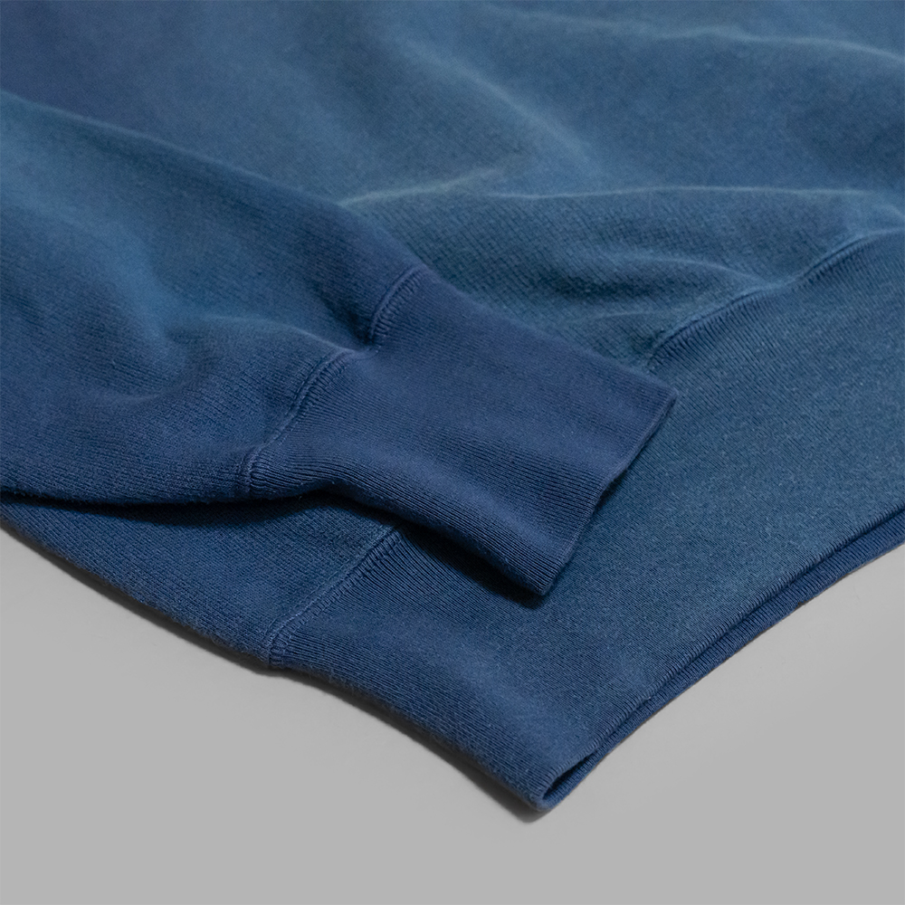 型は、裾のリブがやや強めに窄まることにより、メリハリのあるシルエットが生まれるプルオーバースウェットです。縫製後に製品染めをすることにより、長年使い込んだかのような深みのある色味に仕上げていることもポイントです。