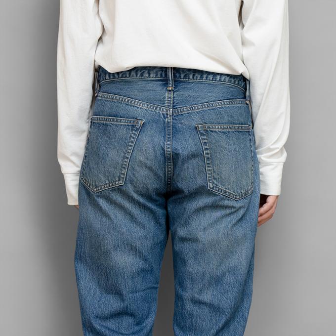 長年穿き込んだ、少し薄めの経年変化を加工で再現しています。カジュアルにも上品なスタイリングにも適したバランスの良い1本で、Teeシャツやスウェットなどのカットソーからテーラードジャケットまで幅広く対応できる汎用性の高さを備えています。