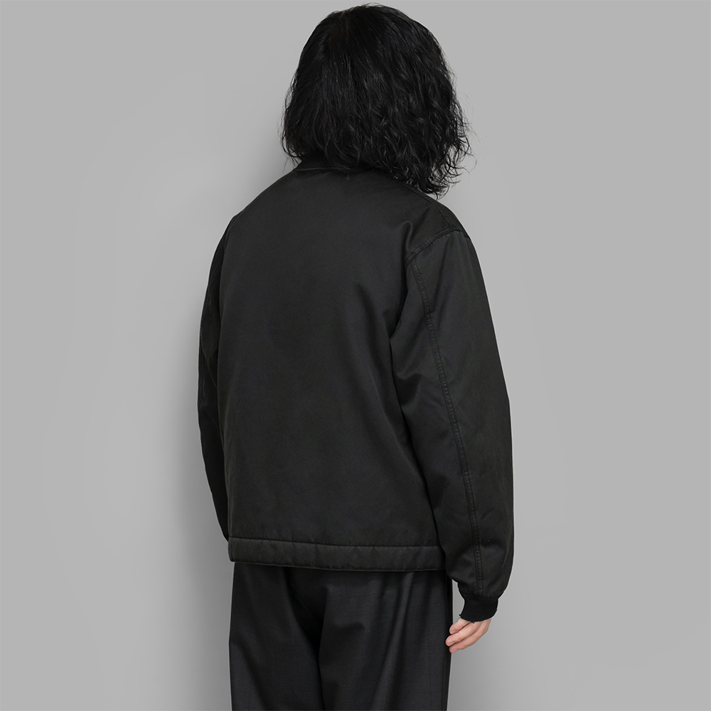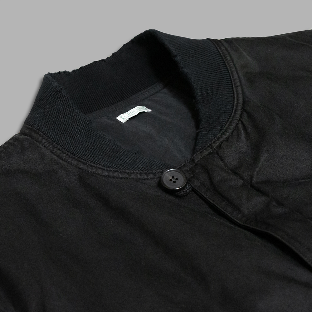 半世紀以上のナイロンの経年変化を、シルクの特徴を活かして、一点一点、職人の手作業で汚れや色の変化を表現した加工も特徴の1つです。程よくフェードした色合いが、アイテムの雰囲気をより一層高めています。絶妙な色差のある黒のワントーンコーデや上質なウールスラックスとのあわせから、ヴィンテージ加工の施されたデニムやコットントラウザーとのあわせまで、様々な着こなしを楽しめます。