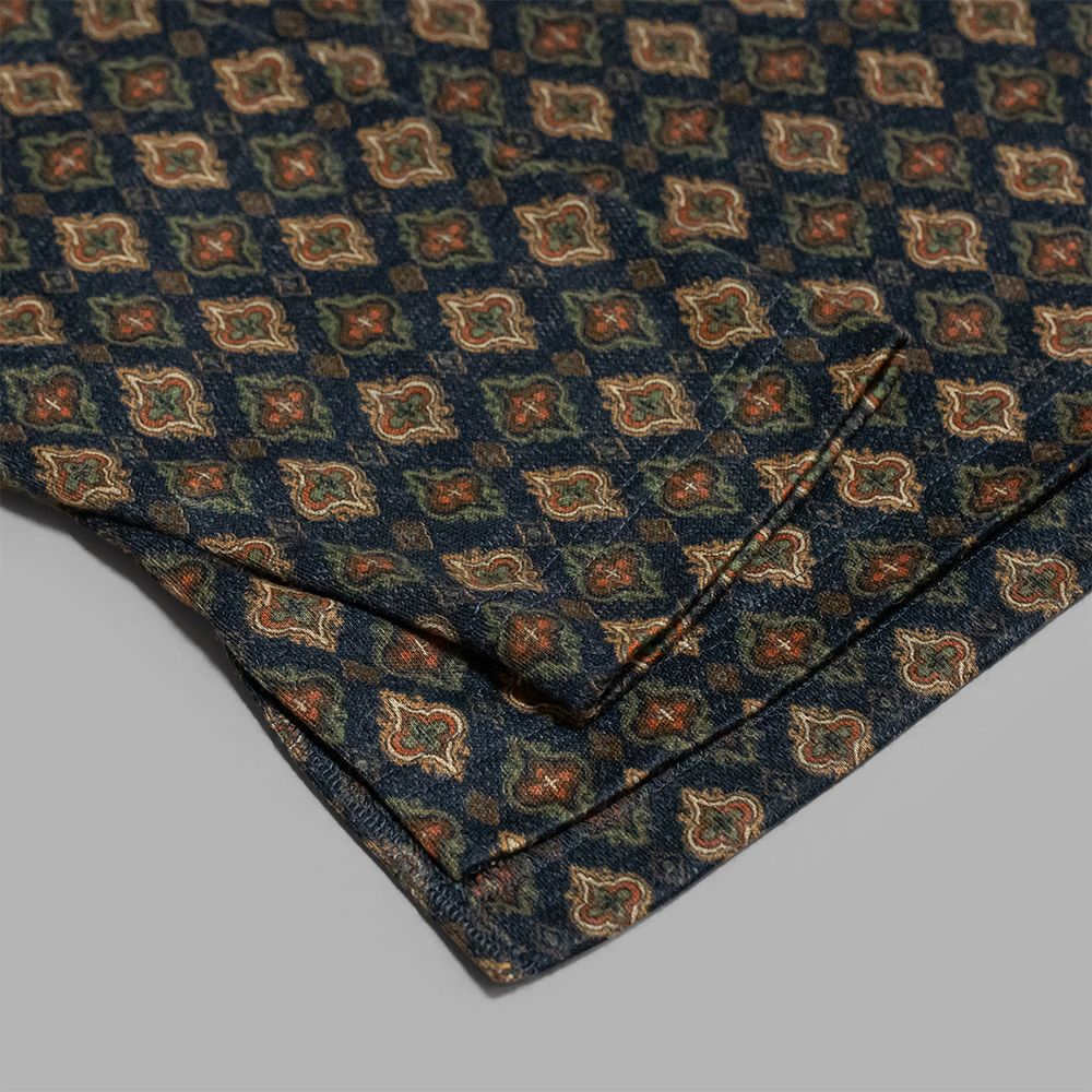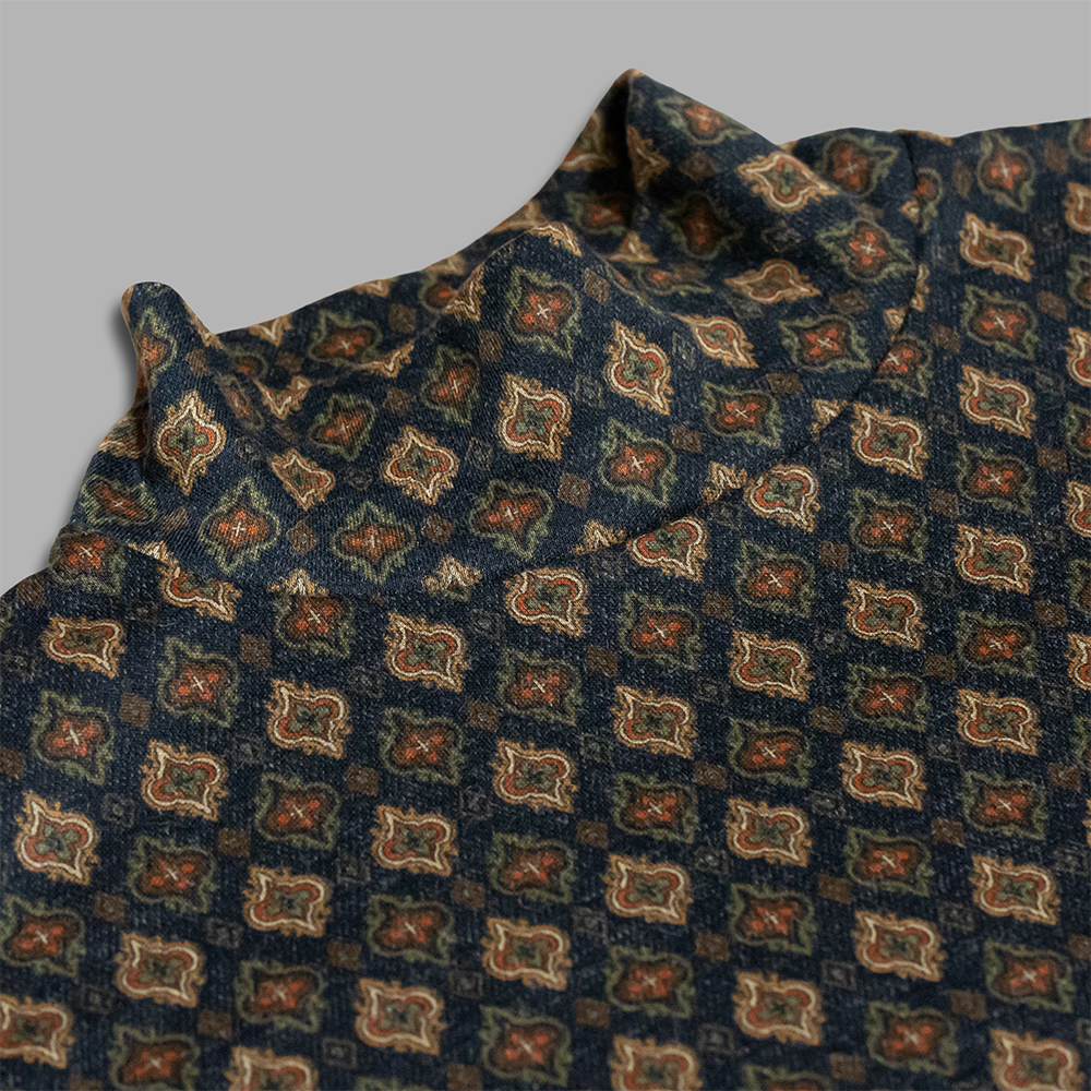 型は、ブランドで定番アイテムとして展開されている、ハイネックのカットソーです。様々なアイテムのインナーとして着用しやすいよう、タイト過ぎないサイジングで製作されています。また、ネクタイで使われるようなクラシックな柄なので、派手さがありつつも、クラシックな雰囲気で着用いただけます。