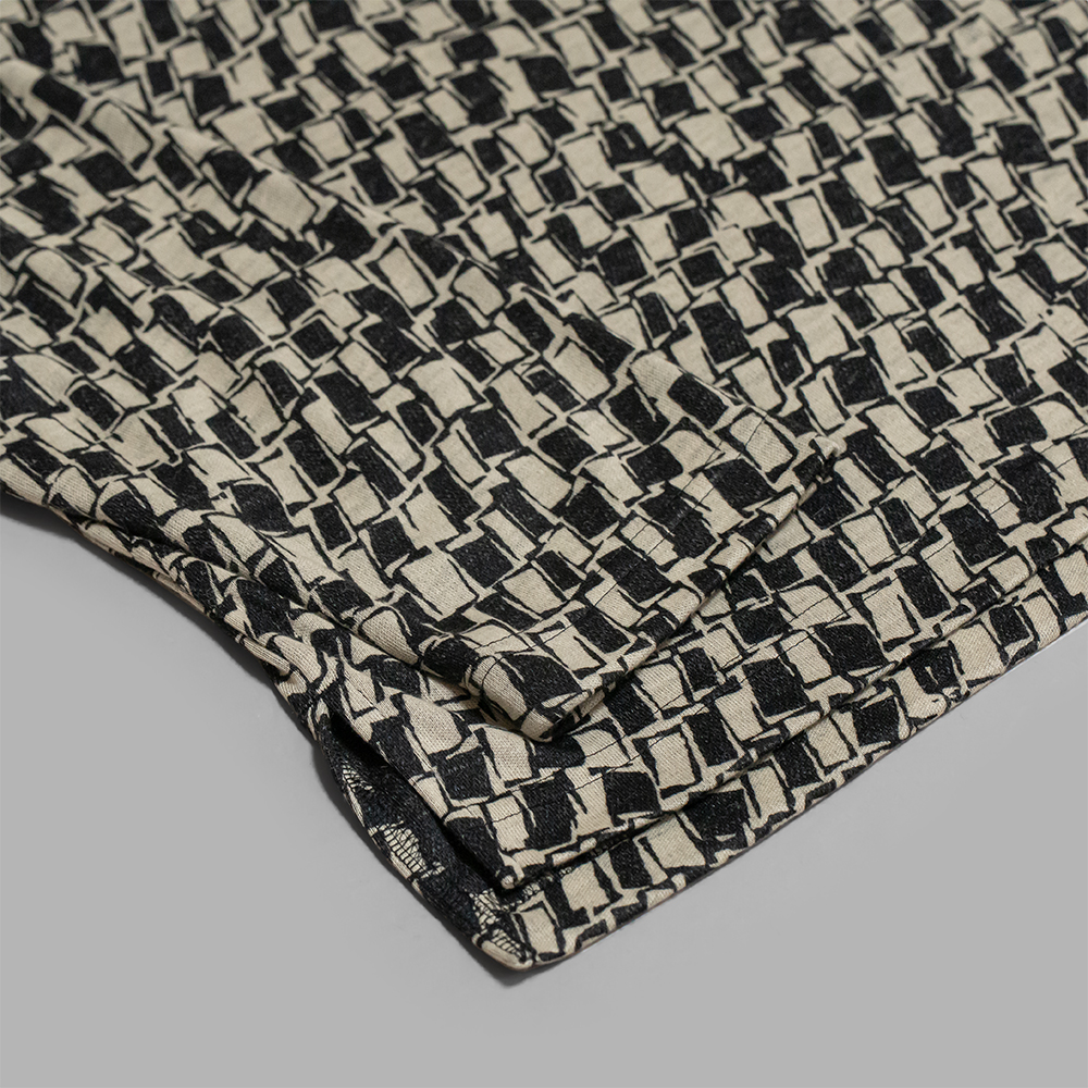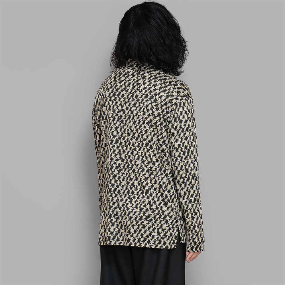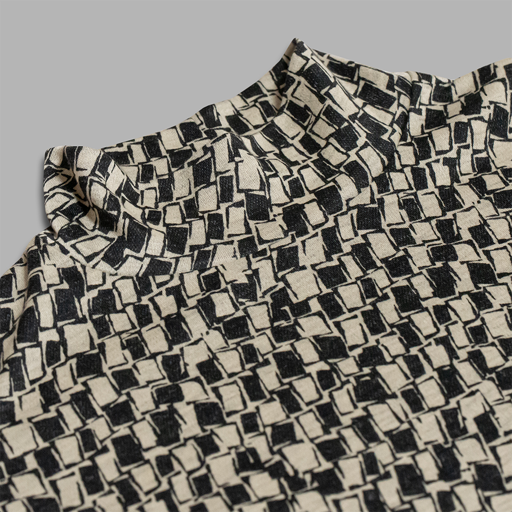 型は、ブランドで定番アイテムとして展開されている、ハイネックのカットソーです。様々なアイテムのインナーとして着用しやすいよう、タイト過ぎないサイジングで製作されています。また、ネクタイで使われるようなクラシックな柄なので、派手さがありつつも、クラシックな雰囲気で着用いただけます。