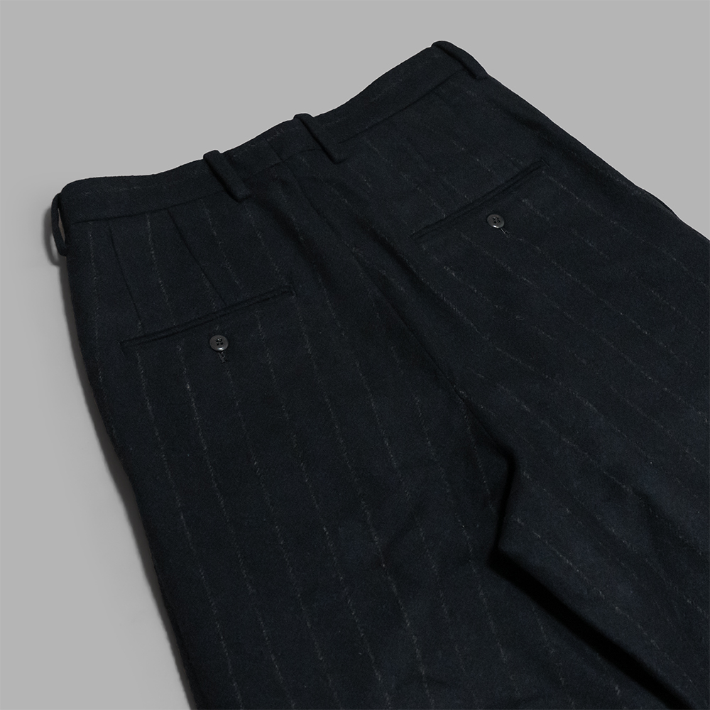 ウールの混紡素材で作製されたフランネル生地を使用しています。ベーシックな綾織とトラディショナルなピンストライプを融合させ、程よく起毛加工を施すことにより、柄がぼやけて、チョークストライプのような見え方へと変化しています。且つ、冬場に履ける厚みをもたせつつ、しなやかで柔らかな質感を兼ね備えていることも特徴です。
