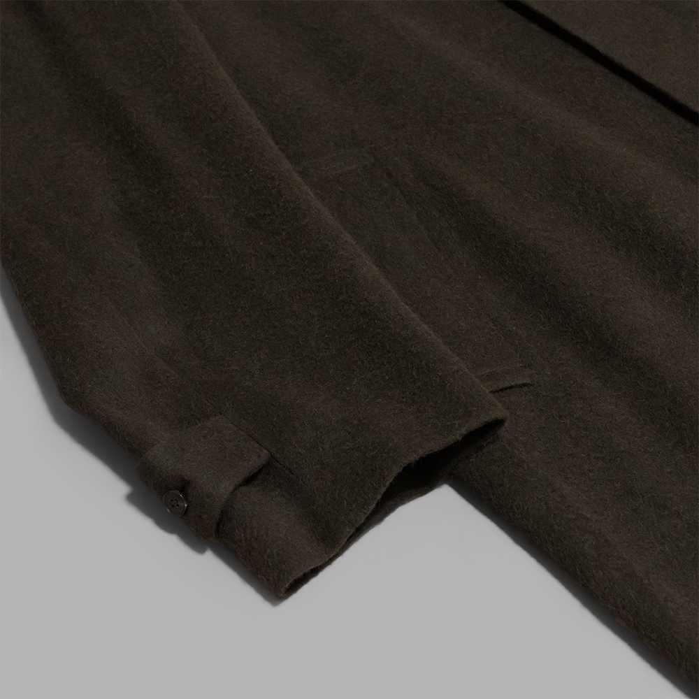 型は、裾にかけて適度な広がりのあるAライン調のシルエットで、ゆったりとしたサイズ感のステンカラーコートになります。また、襟を立ててボタンを留めることにより防寒性を高めることもできます。中はキュプラの総裏仕立てで内ポケットが左右に2つずつ付きます。