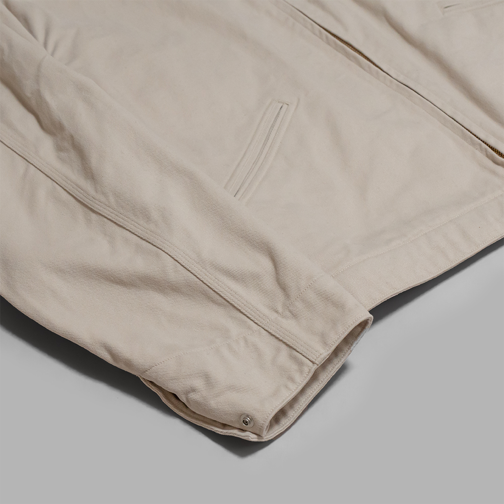 型は、シンプルなジップジャケットで、袖と身頃の脇部分を、トリプルステッチで縫製し、ワークジャケットのような雰囲気にデザインしています。袖口と裾のアジャスターは、スナップボタン留めの仕様です。中はコットンネルの総裏で、内ポケットを2つ付けています。
