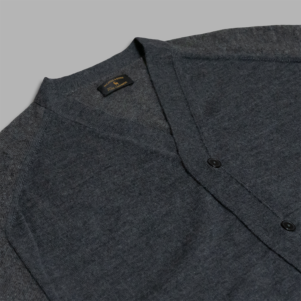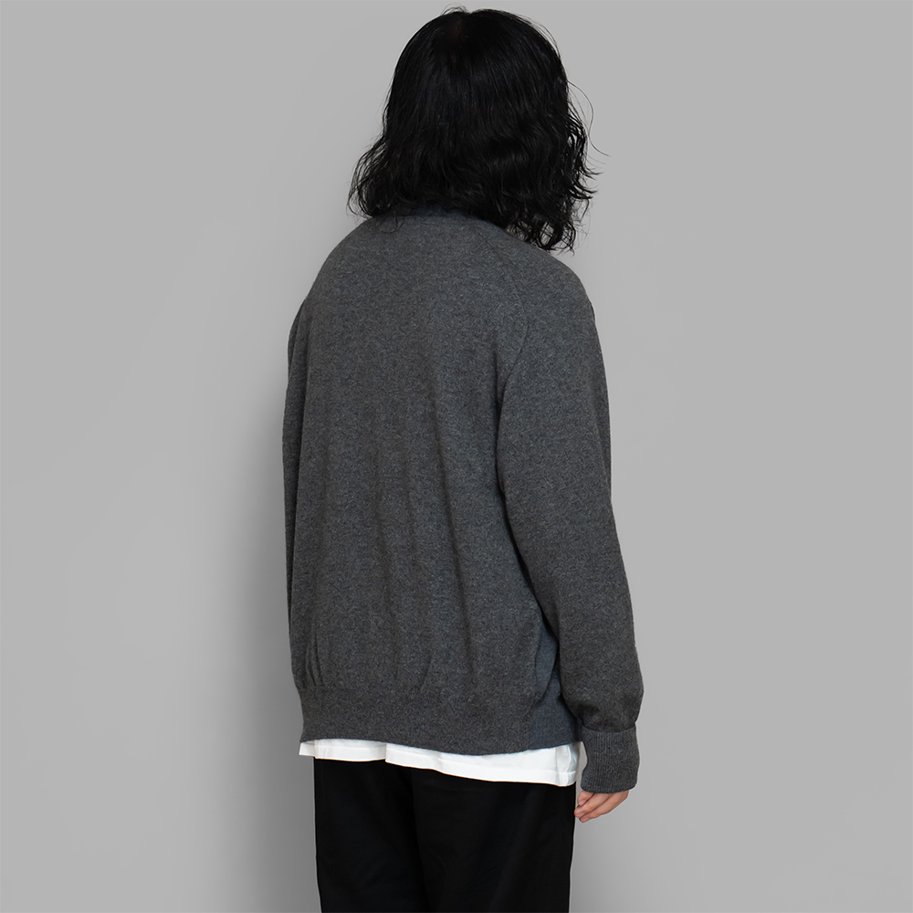 素材は、ハイゲージで綺麗に編み立てられた、なめらかで風合いの良いカシミヤを使用しています。前身頃には、繊維を平行に引き揃え、均一な編み地が特徴的な梳毛糸を使用し、袖と後身頃には、短い繊維を撚り合わせて製作した、程よい起毛感とふっくらとした風合いが特徴的な、紡毛糸を使用しています。同色の糸にはなりますが、異なる種類の繊維を使うことにより、風合いだけでなく、わずかな色の変化も楽しめます。