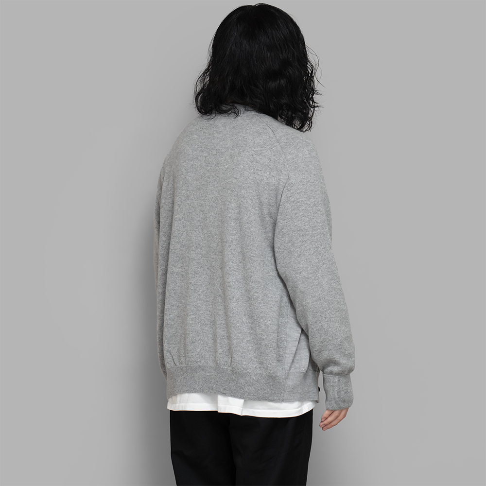 素材は、ハイゲージで綺麗に編み立てられた、なめらかで風合いの良いカシミヤを使用しています。前身頃には、繊維を平行に引き揃え、均一な編み地が特徴的な梳毛糸を使用し、袖と後身頃には、短い繊維を撚り合わせて製作した、程よい起毛感とふっくらとした風合いが特徴的な、紡毛糸を使用しています。同色の糸にはなりますが、異なる種類の繊維を使うことにより、風合いだけでなく、わずかな色の変化も楽しめます。