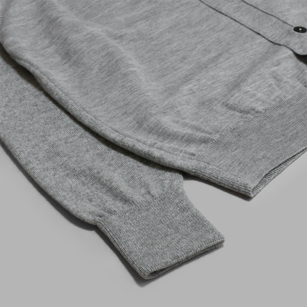 上質な素材を異なる繊維で編み上げることにより、風合いの違いを感じられるだけでなく、コーディネートの程よくアクセントとなり、サラッと羽織るだけで雰囲気良く着用いただけます。また、ボタンやボタンホール位置を、前立てから少しズラすことにより、ボタンを止めた際に前立ての重なりが深くなり、ジャケットのような印象になるデザインも魅力の一つです。加えて、前立ての襟の広がりを抑えたデザインは、ボタンを止めた際に、Vネックのニットのような感覚でも着用でき、アウターとしてだけでなく、インナー使いとしても重宝します。