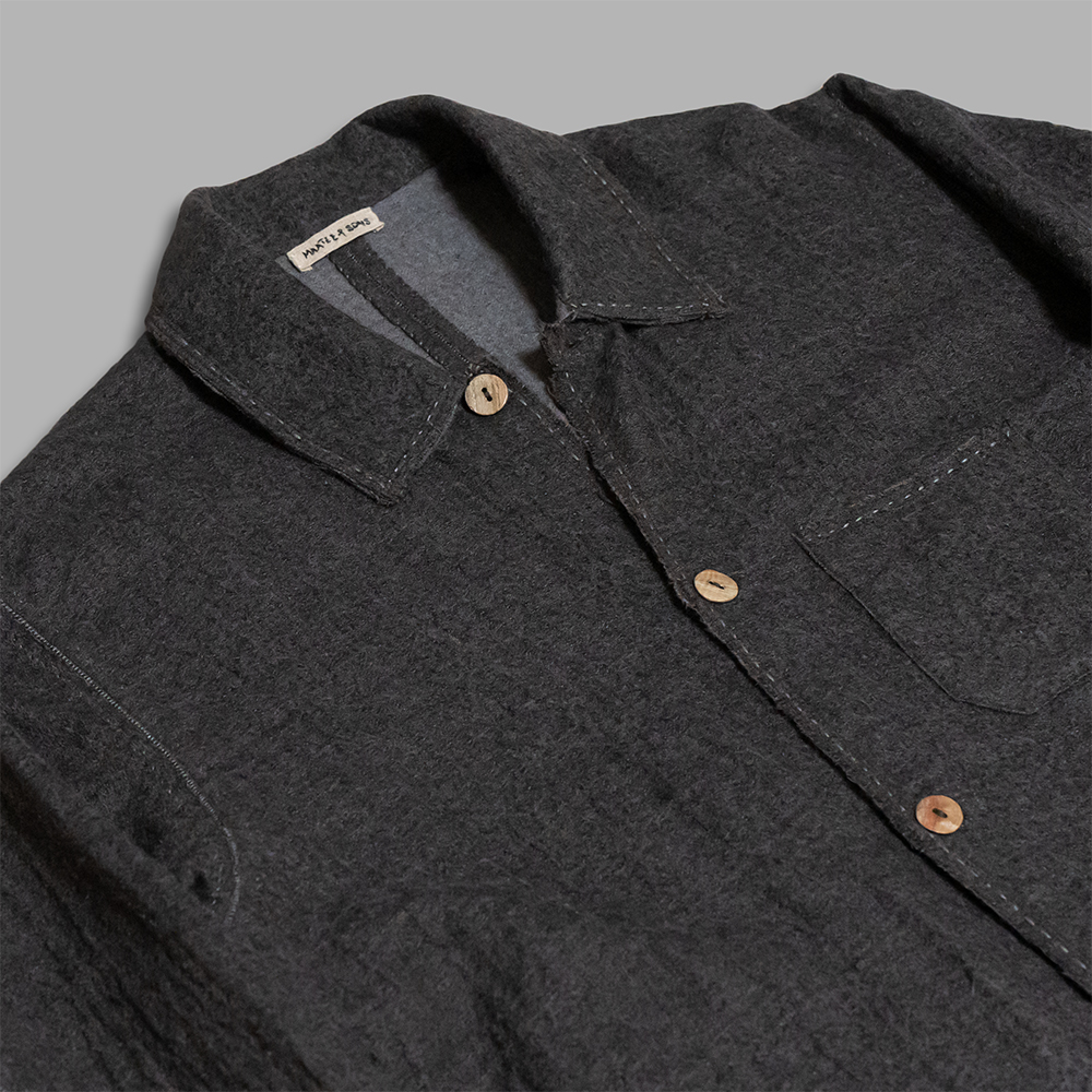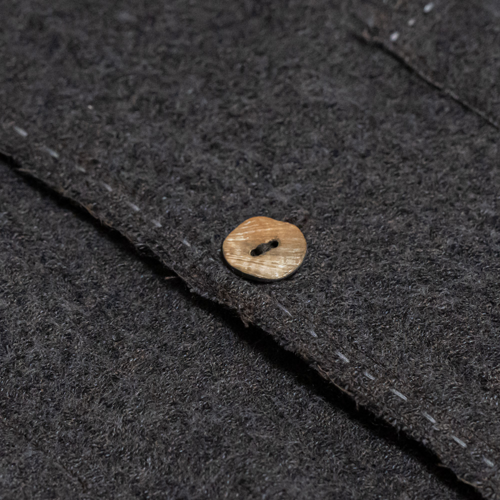 随所に散りばめられた、手縫いならではのステッチは、機械生産には無い温かみや、独特の風合いを感じられる特別な一着となっています。加えて、秋冬通して着られる、汎用性の高さも魅力の一つで、生地の凹凸により、厚みがあるようにも見えますが、着心地はとても軽いため、秋口はシャツジャケット感覚でサラッと羽織ることができます。気温が徐々に下がってきたら、インナーに薄手のニットなどを着たり、冬場は、カーディガン感覚で、コートの中にあわせることも可能です。