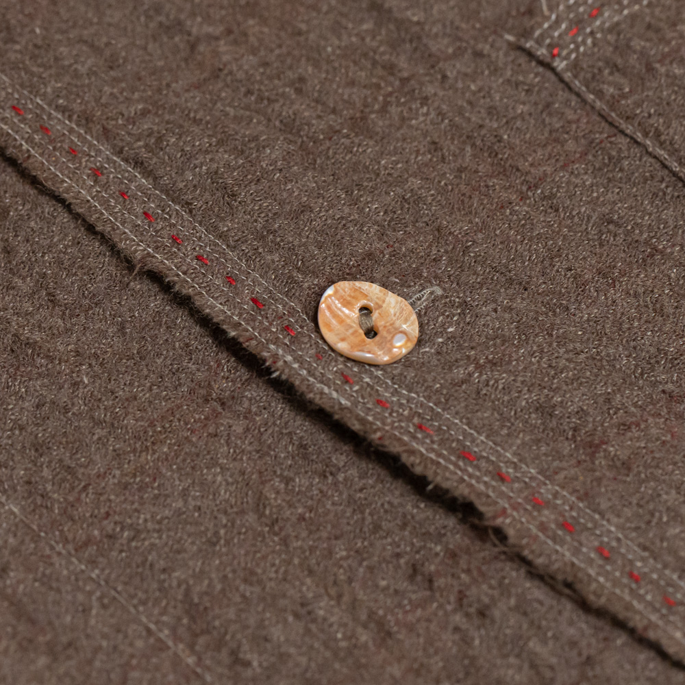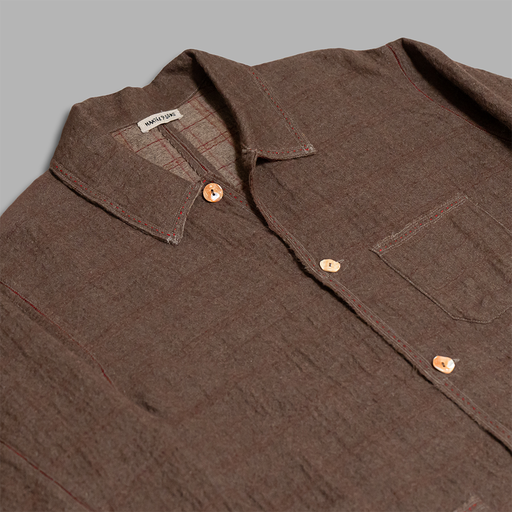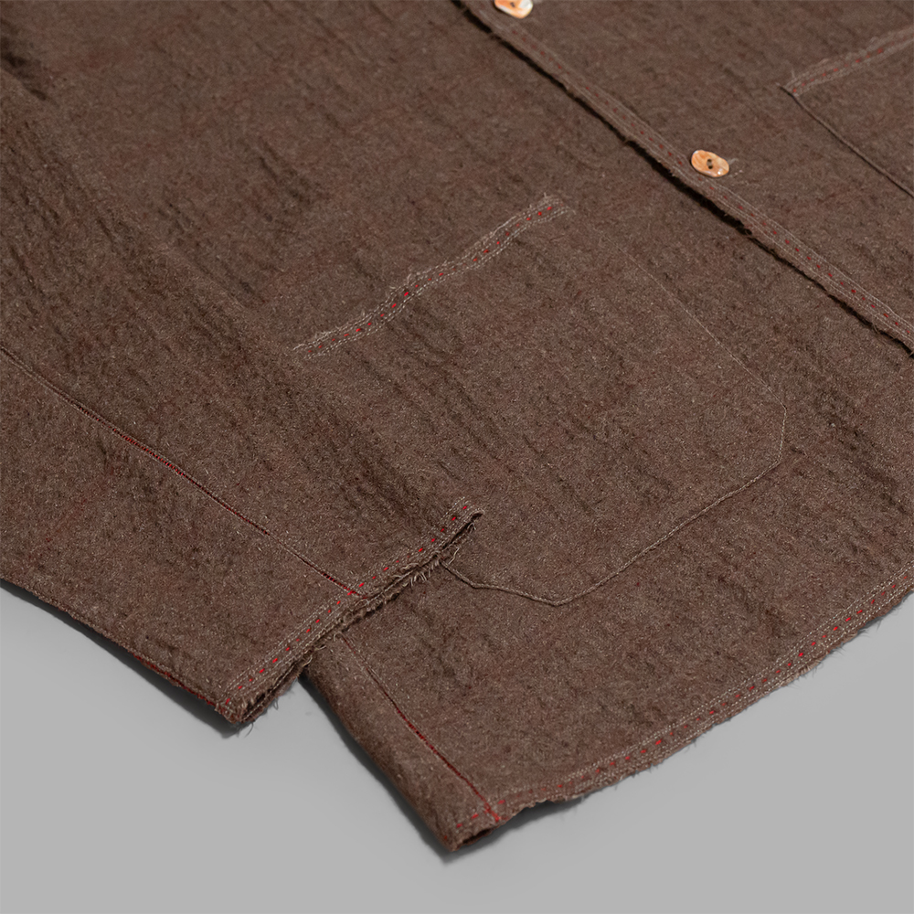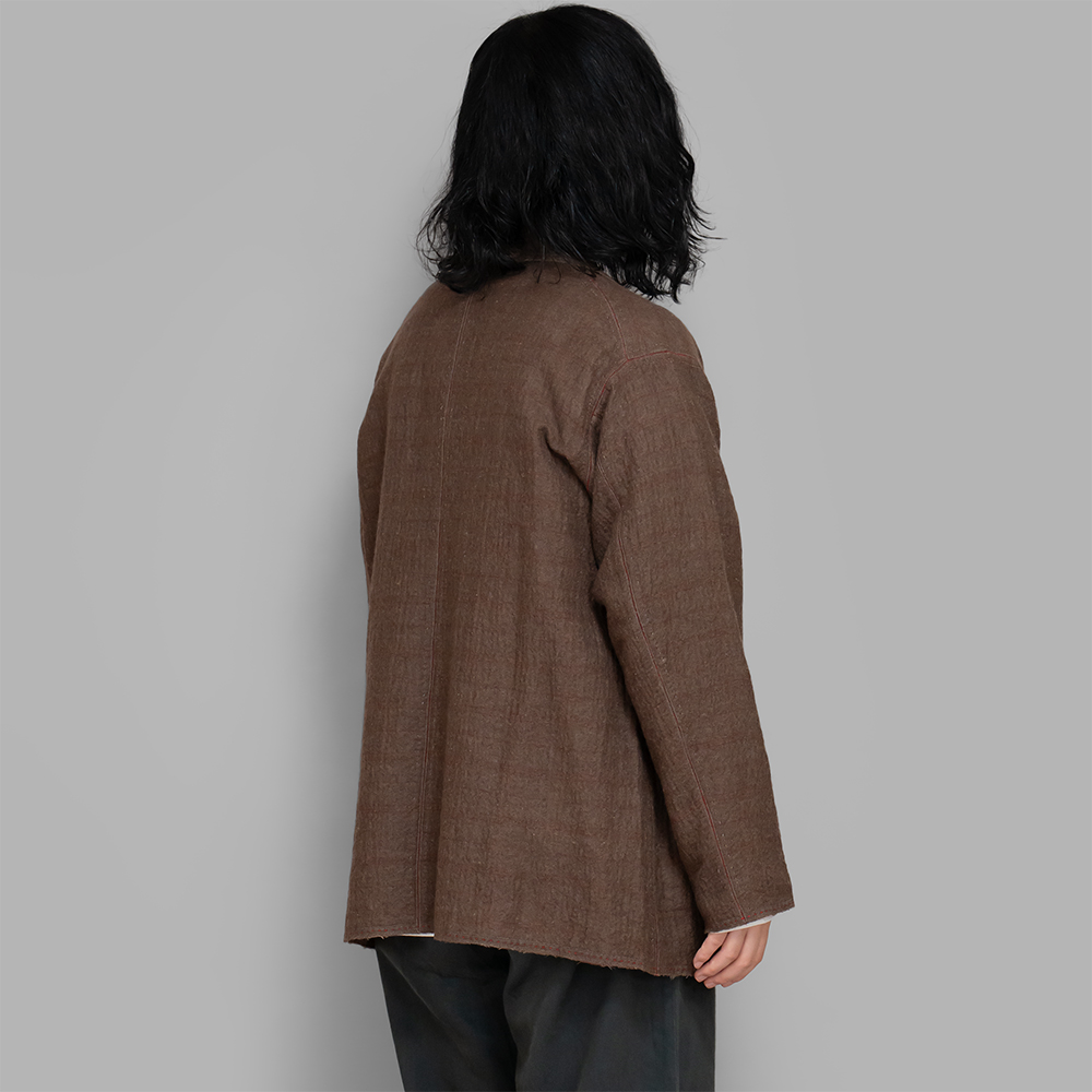 随所に散りばめられた、手縫いならではのステッチは、機械生産には無い温かみや、独特の風合いを感じられる特別な一着となっています。加えて、秋冬通して着られる、汎用性の高さも魅力の一つで、生地の凹凸により、厚みがあるようにも見えますが、着心地はとても軽いため、秋口はシャツジャケット感覚でサラッと羽織ることができます。気温が徐々に下がってきたら、インナーに薄手のニットなどを着たり、冬場は、カーディガン感覚で、コートの中にあわせることも可能です。