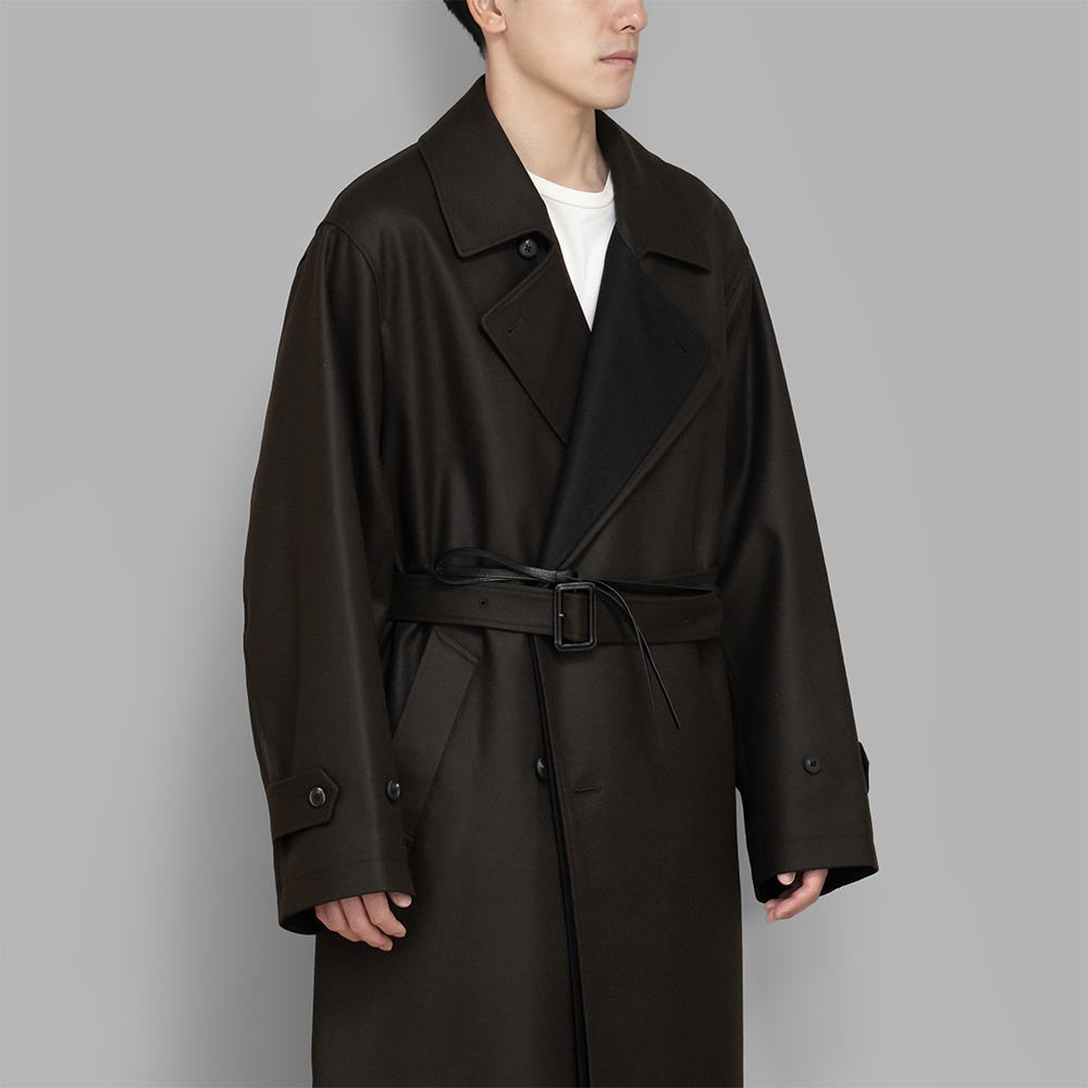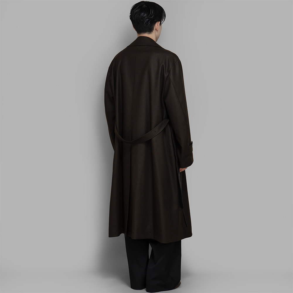 型はダブルブレストのロングコートをベースに、ゆったりしたサイズ感で作製しています。前はボタンやベルトで留める仕様でつくられています。付属するベルトの他にレザーの紐がウエストに縫い込まれており、紐穴を使用しながら様々なシェイプができるようにデザインされています。また、レザーの紐は中に通すことで、内側に隠すこともできます。中はキュプラの総裏仕立てで内ポケットを2つ付けています。