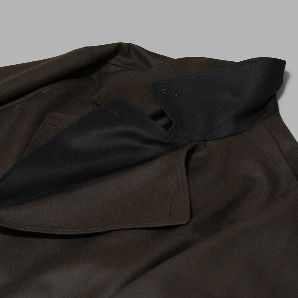 また、内側ラペル、襟裏、ウエストベルト裏、袖タブ裏にウールフラノ素材を使用し、生地感、色味にコントラストをつけていることもポイントです。