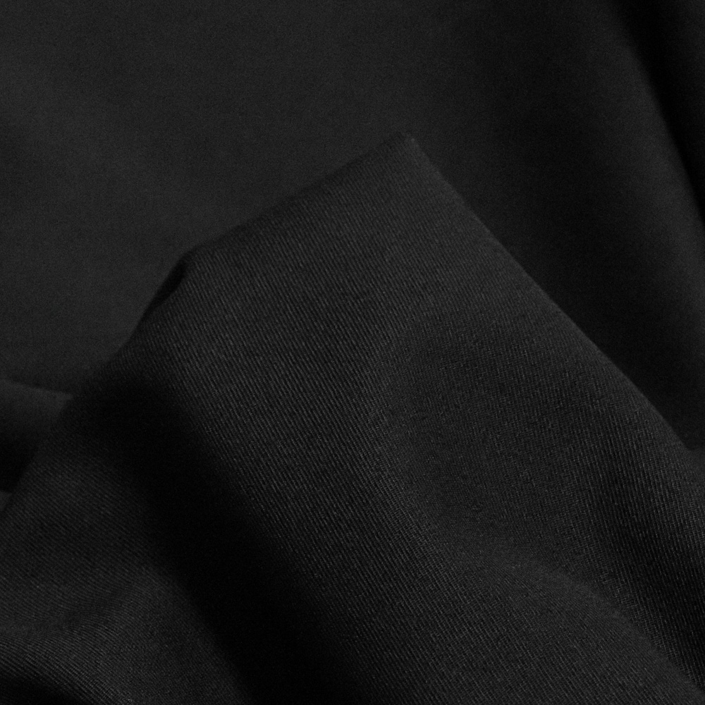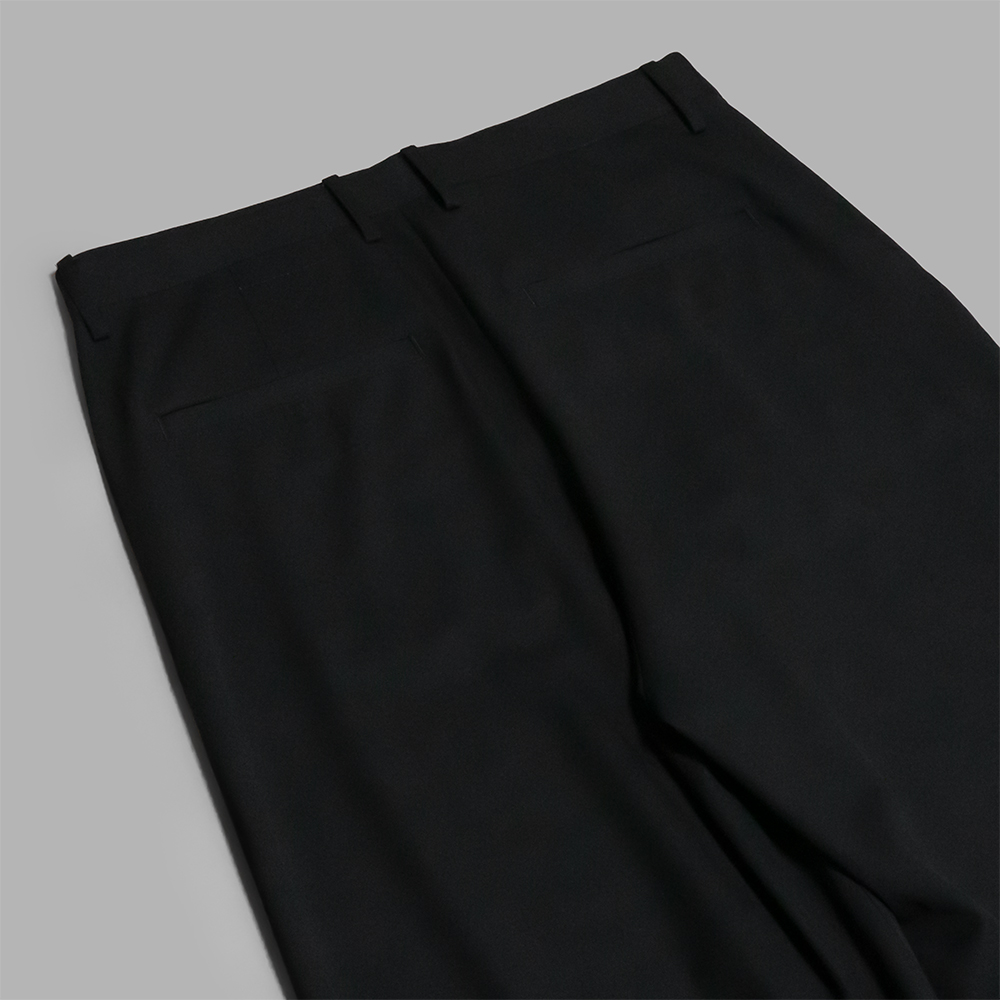 梳毛のウール糸を高密度に織り上げたツイル組織のウール素材を使用しています。適度なハリ感がありながらも、ドレープが入るほどにしなやかで、サラッとした肌触りが特徴的です。表面起毛は無いので、様々な季節に履ける汎用性の高さを備えていることもポイントです。