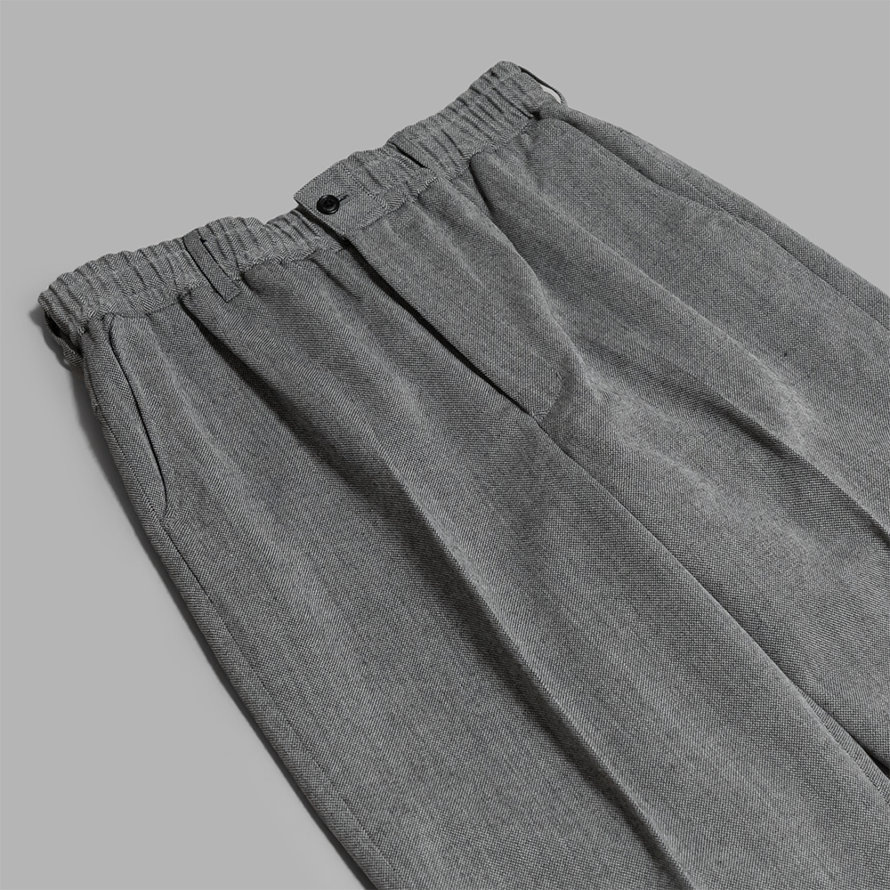 型はワイドテーパードシルエットのイージーパンツです。腰回りはドローコードとゴムを通した仕様で作られており、ベルトレスでの着用もできますが、ベルトループも付いていますので、ベルトを通して着用することも可能です。前立てはジップフライ、中は半裏の仕様です。
