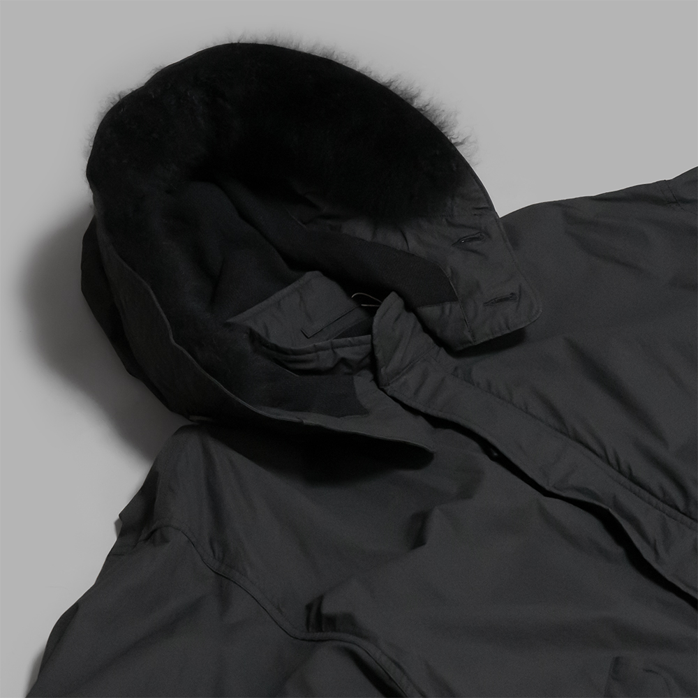 型はミリタリーのフーデッドコートで、ゆったりしたサイズ感で作られています。フードは取り外し可能で、中は、柔らかくて軽いウールの総裏で、内ポケットを2つ付けています。