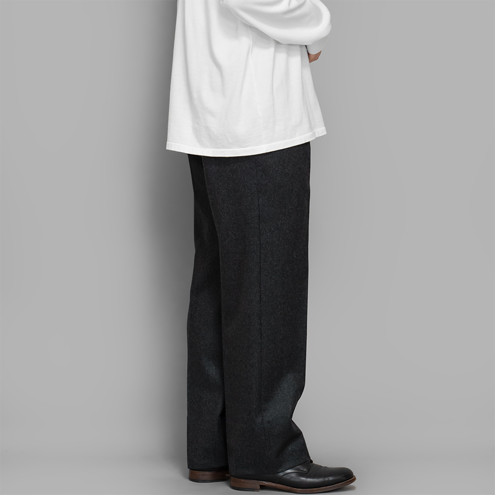型は、適度にゆとりがありながらも、スッキリと綺麗なラインで着用することができる絶妙なサイズバランスで製作された、微かにテーパードのかかったワンタックのスラックスです。裾が綺麗に落ちることも特徴で、レザーシューズは勿論のこと、スニーカーでもあわせやすい形になっています。前立てはジップフライで、中は半裏の仕様です。
