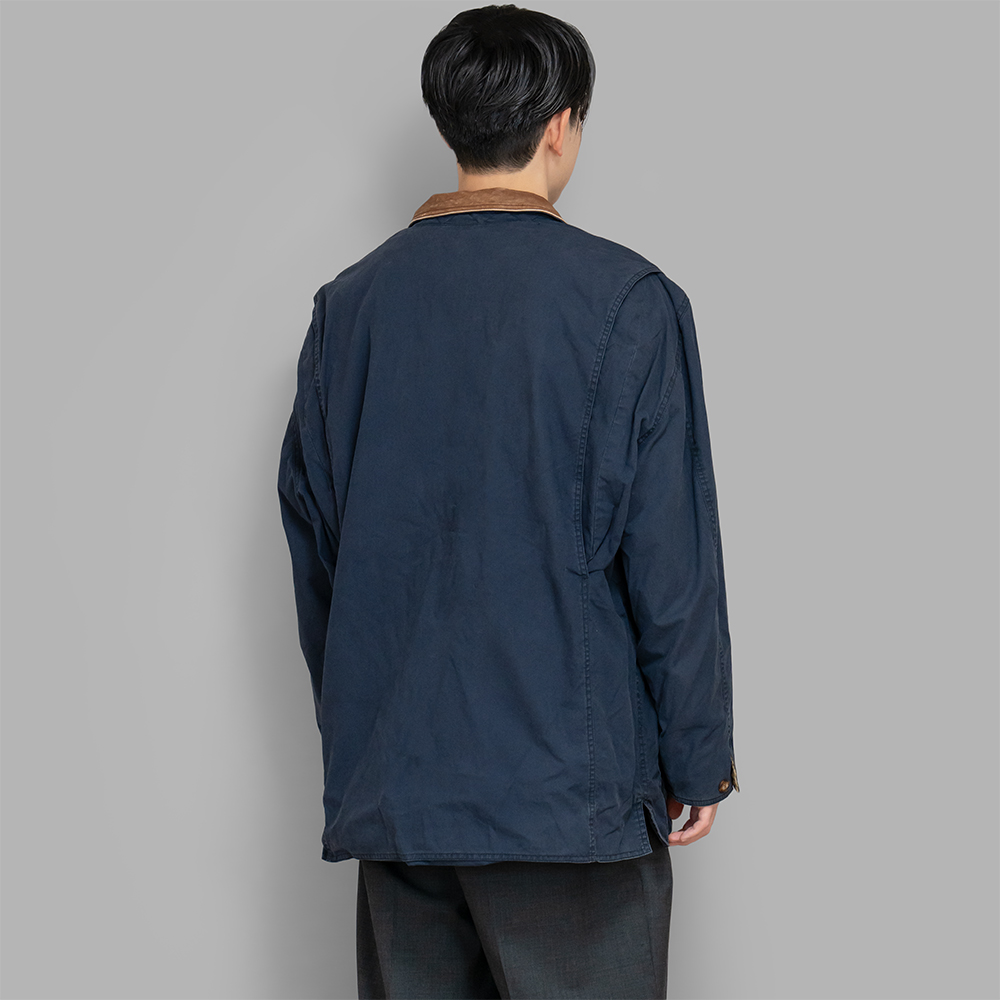 型にはハンドウォーマーポケットがつく仕様に、隠しフラップポケットのつく粋なデザインが施されています。背面には両腕の可動による生地の引っ張りを極力なくす役割やスムーズな動作を行えるようにと、アクションプリーツの仕様が採用されています。また、ヴィンテージハンティングジャケットではお馴染みのディテールのガンパッチやゲームポケットのデザインは排除され、タウンユースでも着やすく仕上げられています。加えて、袖裏には裏地がつき、袖が通しやすいように計算されています。