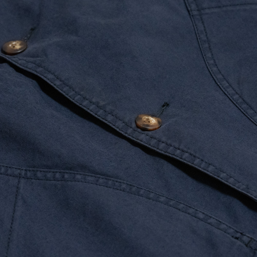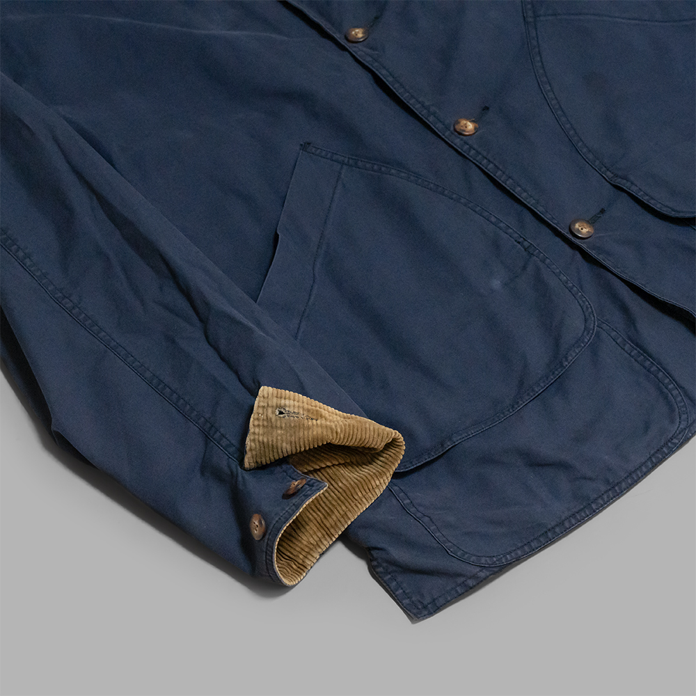 生地には平織りのコットンが使用されており、襟にはレザーの仕様と洗練された1着です。また、袖裏には太畝のコーデュロイがつく仕様で、お好みで、袖を1つ折り返し、袖裏のコーデュロイを覗かせる着用も可能となります。