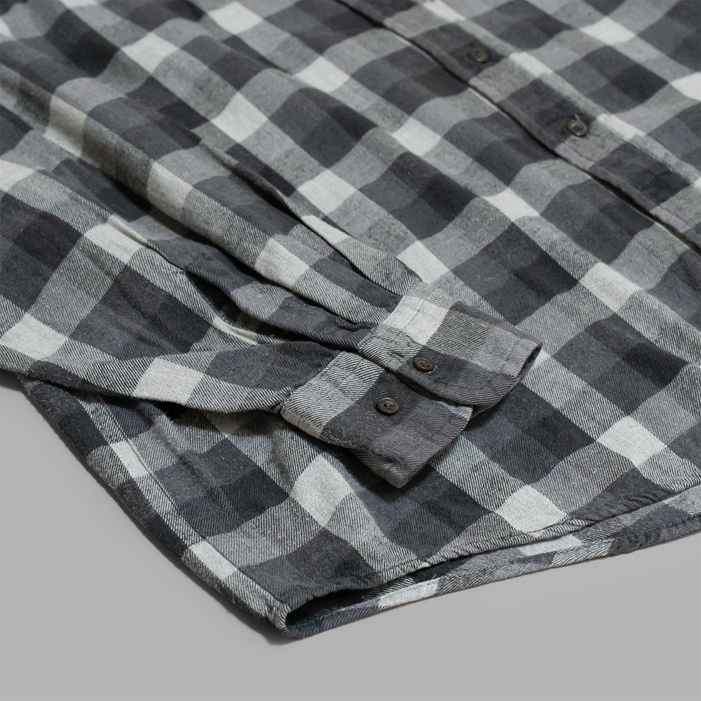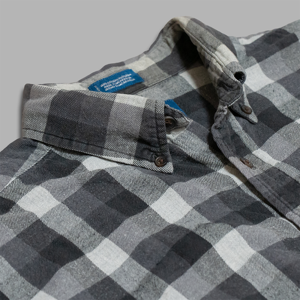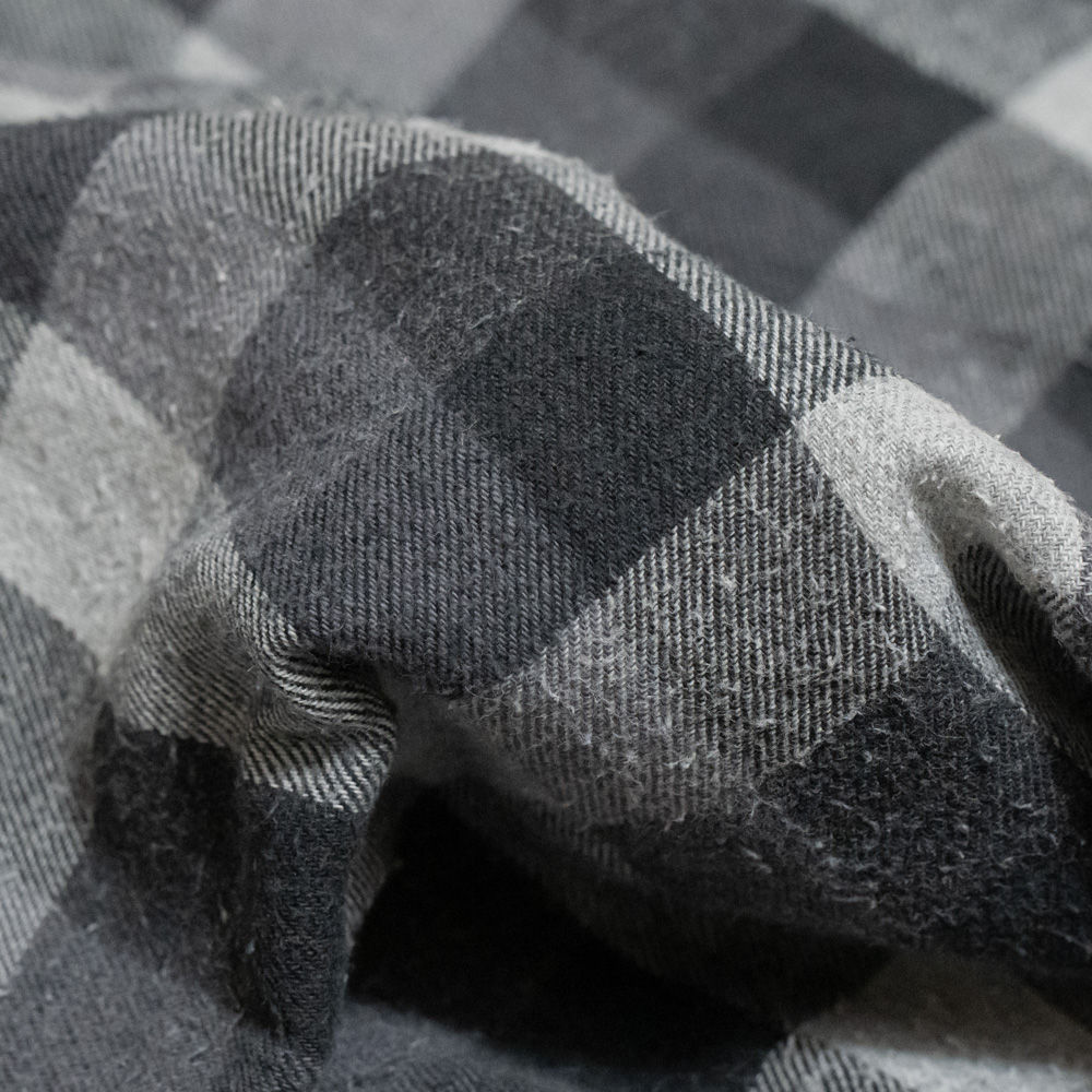 1980年代頃に生産されたものになります。生地にはライトな質感のコットンネル素材に加え、モノトーンのブロックチェックでありながら、グレーのトーンにバリエーションを持たせ、奥行きのある色柄が魅力な1着です。