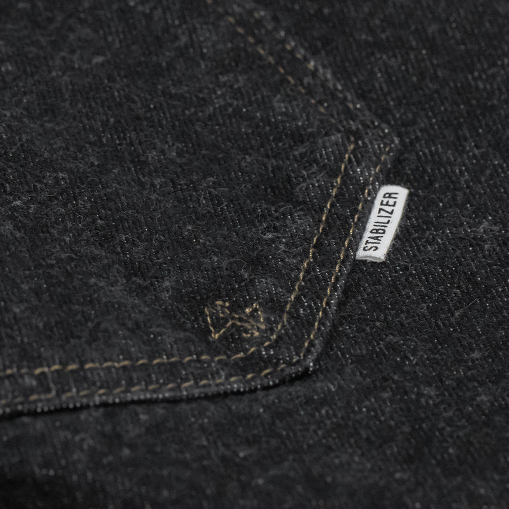 岡山にて作製されたオリジナルの13.5ozセルヴィッチデニムを使用しています。デニムの合理化が進んだ1980年代のデニムをベースに、タテ糸はブラック、ヨコ糸がホワイトで織り上げられた生地です。