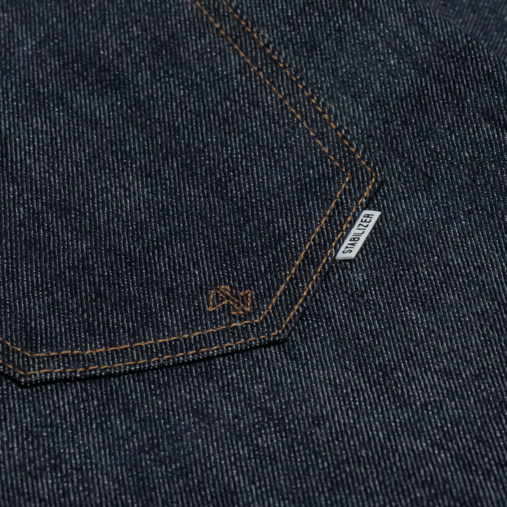 岡山にて作製されたオリジナルの14ozセルヴィッチデニムを使用しています。加工についてはサンフォライズド加工(防縮加工)のみで、毛焼きやネジれ防止加工は行わず、デニムの風合いをそのまま活かす形で仕上げています。