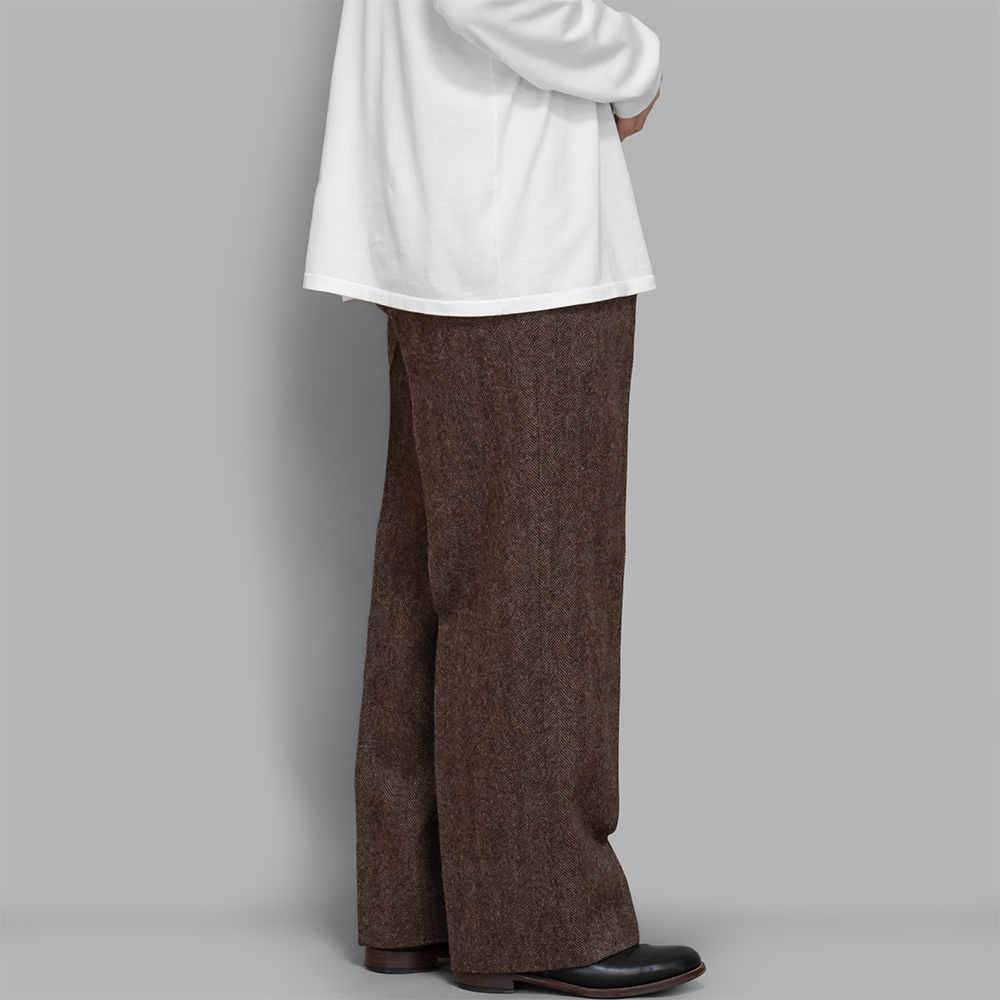 素材には老舗のテキスタイルメーカーの手がける、クラシカルなウールツイードを使用しています。適度にゴワつきのある力強い質感と、紡毛糸による色の重なりやぬくもりのある配色が特徴的です。また、ハリのあるツイード素材はボトムスのシルエットを綺麗に出してくれるので、秋冬のトラウザーに適した質感です。