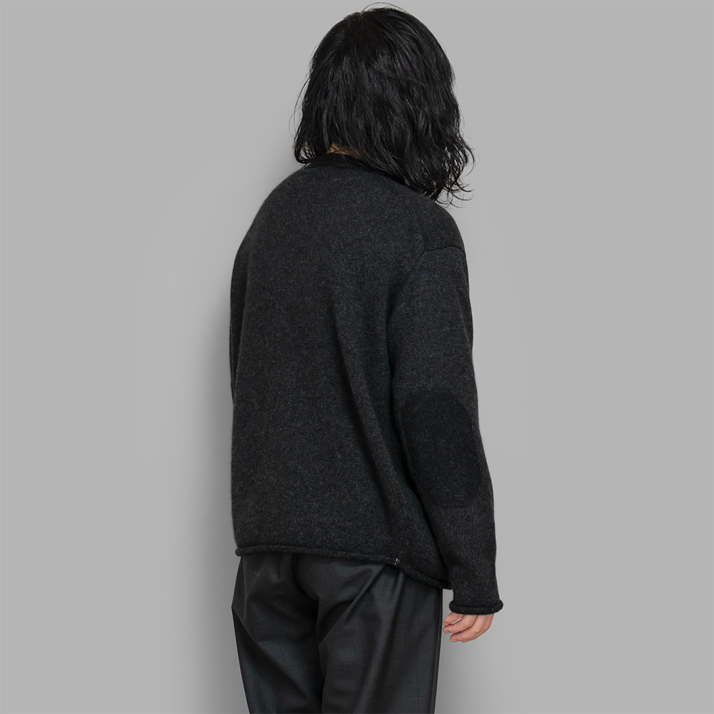 型はクルーネックのジップジャケットで、インナーにシャツやニットを重ねられるようにゆとりを持たせたサイズバランスでデザインされています。裾と袖はロールさせグリカンで止めた仕様で裏地の素材が見えてくれます。また、エルボーパッチは編み地を変化させて、裏のシェットランドウールが表に出る仕様です。