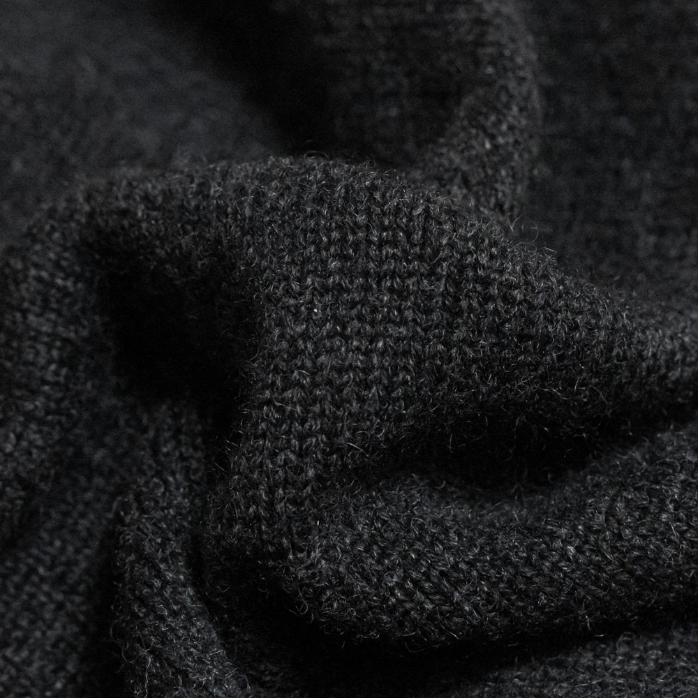 異なる2本の糸を、“ひょっとこ”と呼ばれる給糸口を用いて、表と裏で綺麗に分けながら編み立てたニット素材を使用しています。表はカシミヤ、裏は強撚のシェットランドウールになります。両面共に起毛加工を施し、ふっくらとした質感に仕上げています。また、表のカシミヤに裏のシェットランドウールが干渉することによってカシミヤニットとは異なる色味の深さや、弾性のあるニット素材になっています。