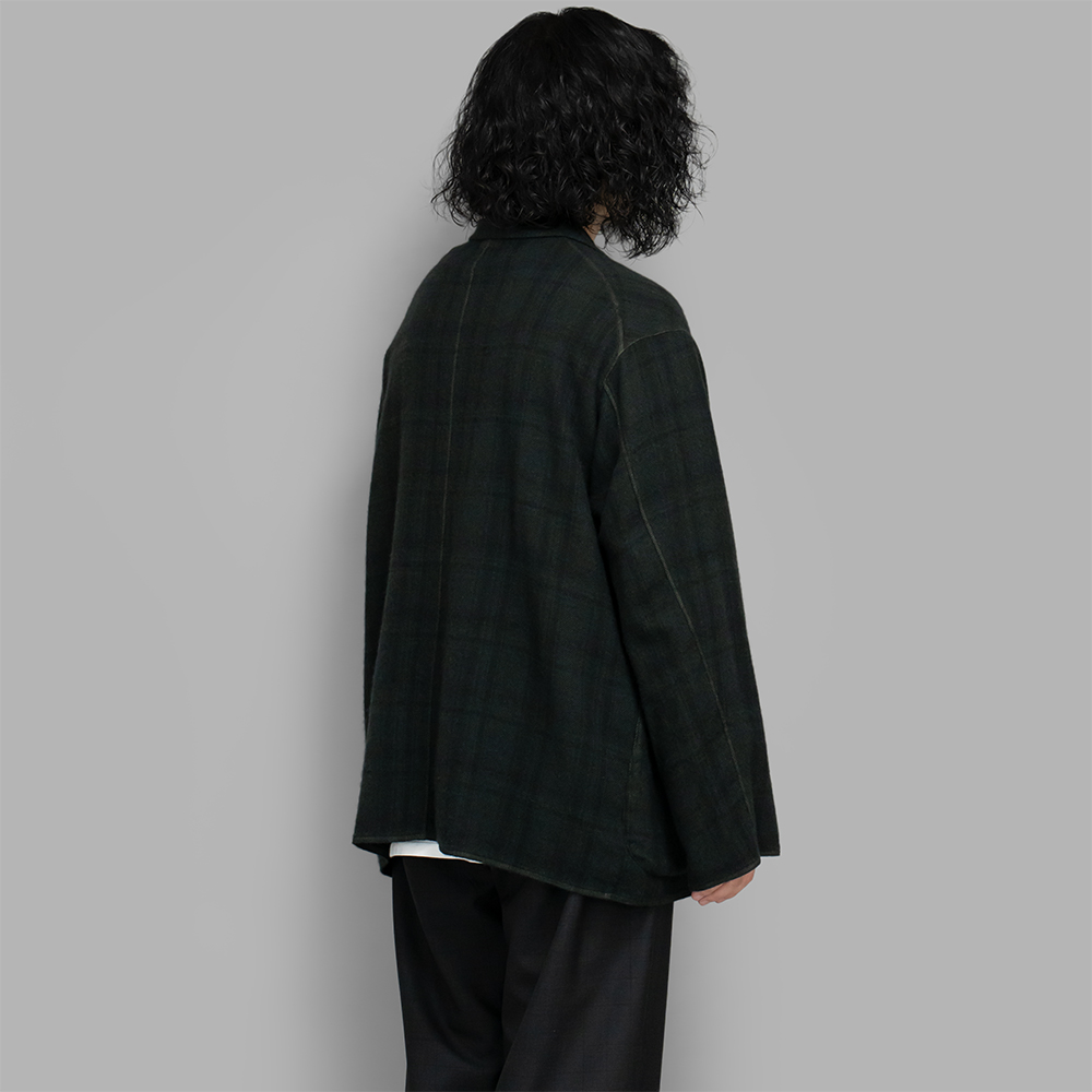 繊細な素材のカシミヤに丁寧に加工を施し、適度な厚みとクタッとした表情に仕上げたカシミヤネル素材を使用しています。製品染による深いチェックの柄の他、縫い目が特徴である折って折ってJKならではの、シーム部分の色の入り方もポイントです。