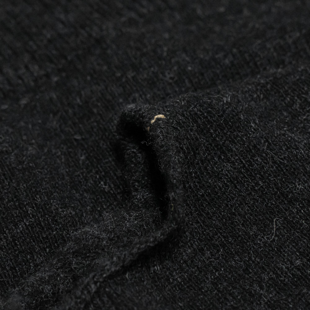 異なる2本の糸を、“ひょっとこ”と呼ばれる給糸口を用いて、表と裏で綺麗に分けながら編み立てたニット素材を使用しています。表はシェットランドウール、裏は起毛させたカシミヤになります。表のシェットランドウールに裏のカシミヤが干渉することによって、複雑な色味を表現しています。