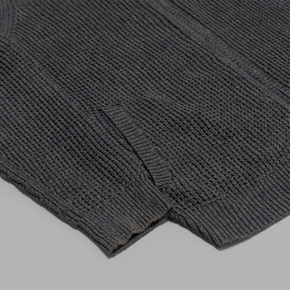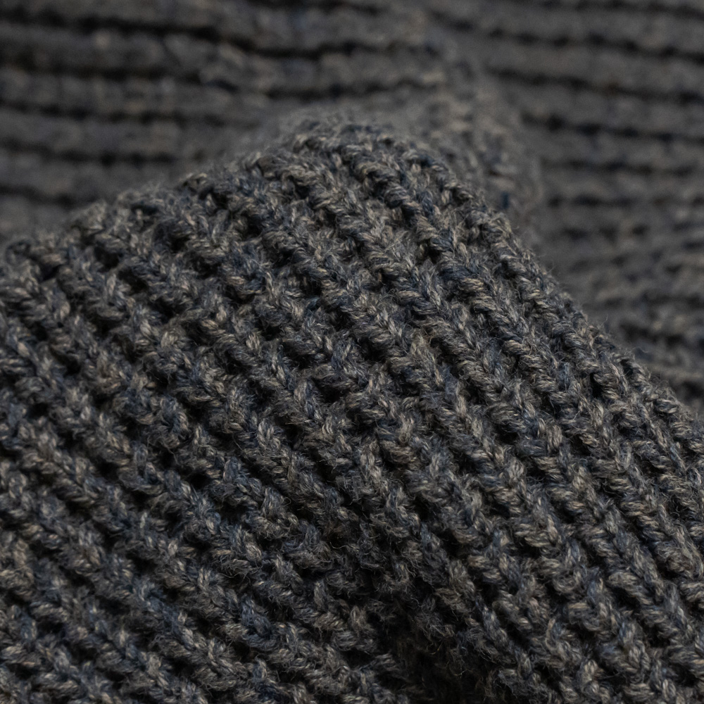 生地はオールコットンで編み立てられており、ブルーとブラウンで形成された、絶妙な色味が同アイテムの魅力の1つです。ざっくりとした編み目により、ニット特有の優しさと温かみのある表情が特徴です。