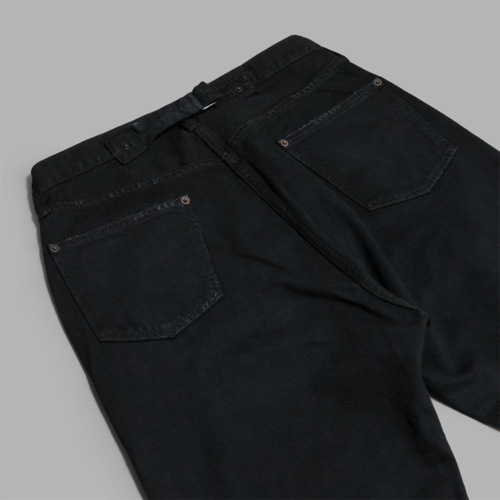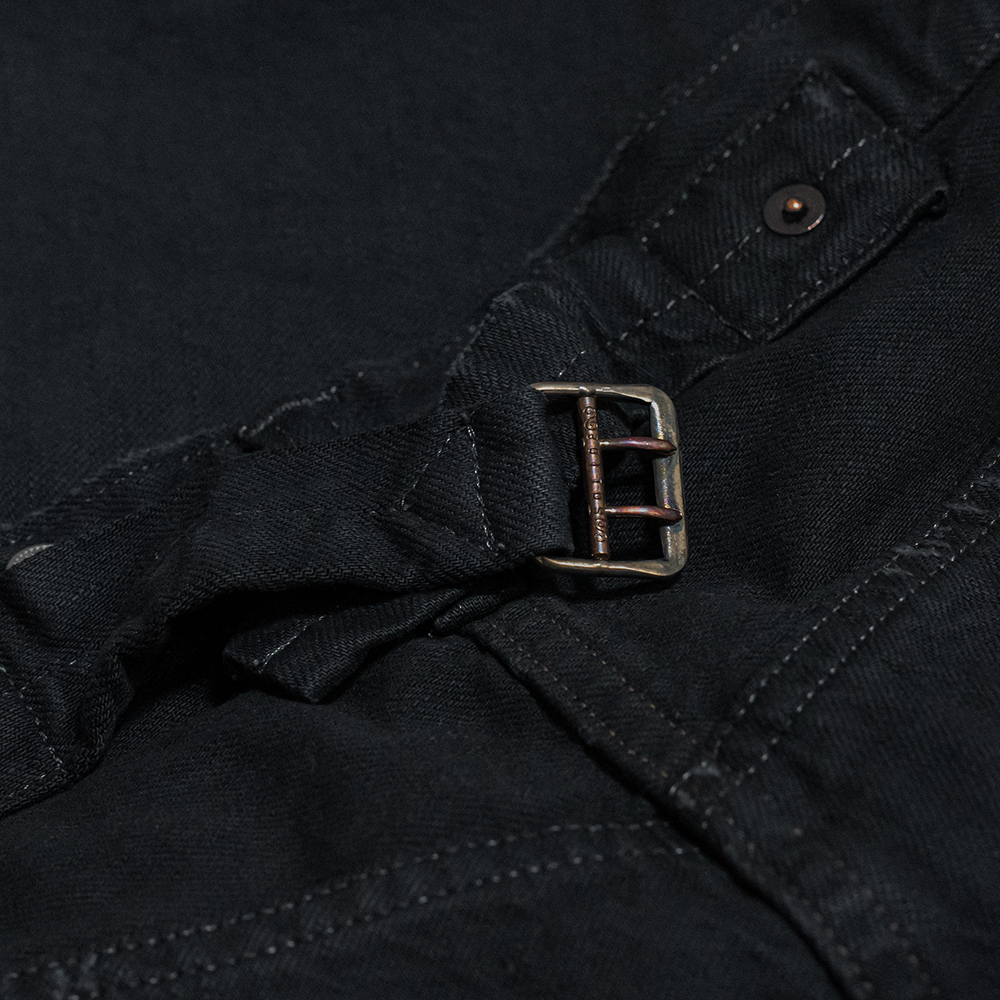 加工は、手作業でしか表現できない工程を重ねて、ブラックデニムのヴィンテージを再現しています。前オーナーが染め直しをしながら長年着込まれたかのような、唯一無二のカスタムメイドのような雰囲気に仕上げられています。