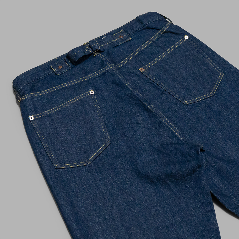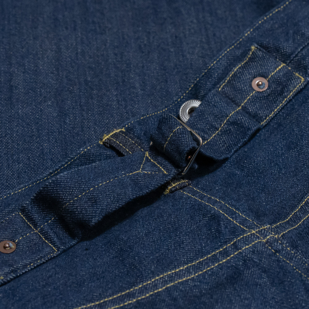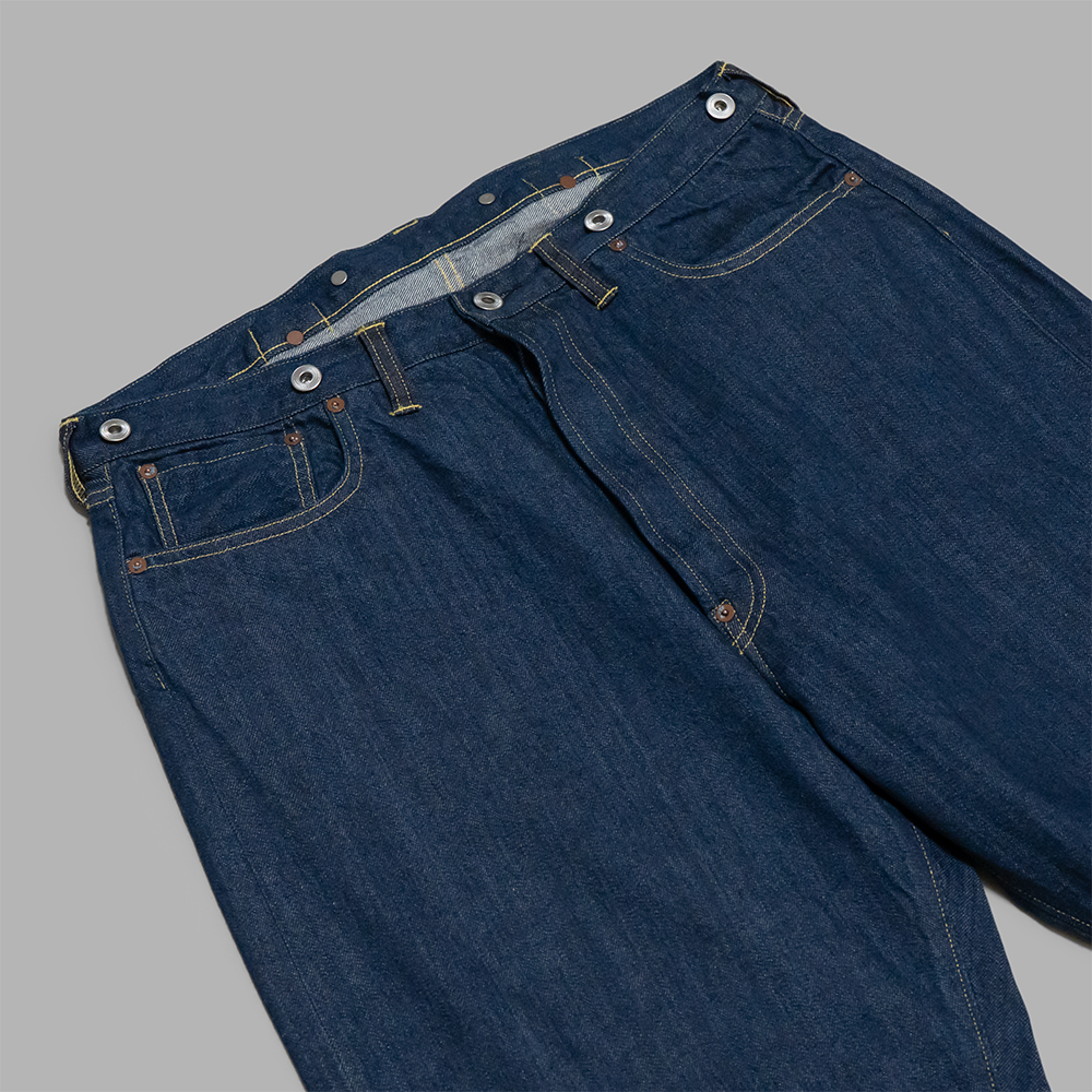 型は1922年モデルの501XXをベースに、バランスを整えた太めのシルエットで作られています。上流階級だけではなく若い労働者階級にもベルトが普及した時代でもあり、この年から初めてベルトループが採用されています。それまでのシンチバックやサスペンダーボタンも残され、変換期ならではの多種多様なディティールを備えています。前立てはボタンフライの仕様です。
