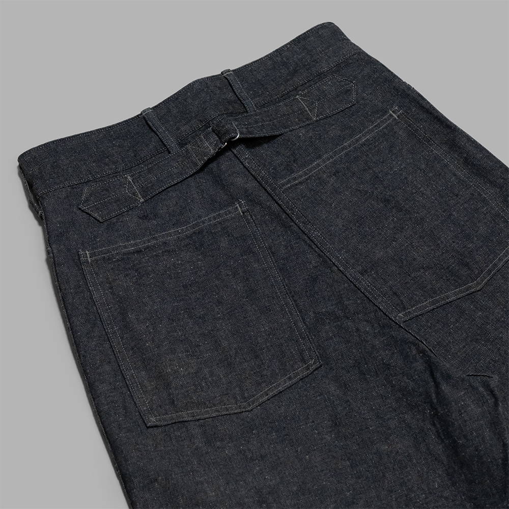 型はフロントとバックに配された大きなパッチポケットが特徴的である、M35デニムをベースにデザインされています。当時支給されていたサイズ感はかなり大まかであったため、ウエストはシンチバック仕様で、ステッチには白糸が多く使用されていたが、グレーの例も確認されており、こちらにもそれを反映させています。前立てはボタンフライです。