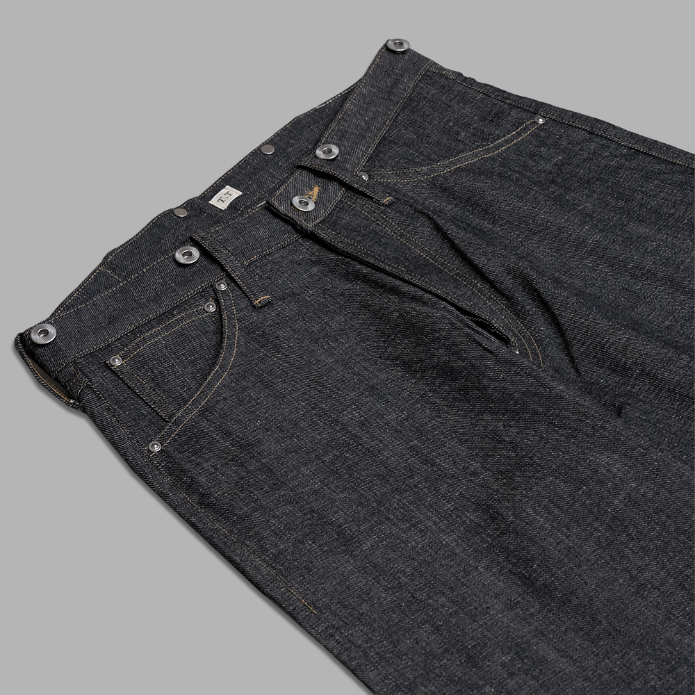 型は股上がかなり深く、わたりから裾まで真っ直ぐに落ちた太めのシルエットが特徴。丸くカーブしたフロントのポケットに、明き部分に付いたリベット、後ろ側についてあるバックルバックなど残すべき部分は残した設計になっています。前立てはボタンフライです。