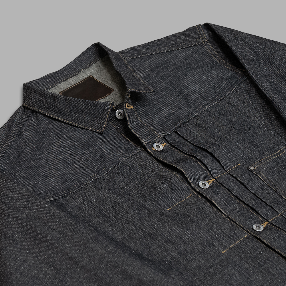仕上げには、サンフォライズドと呼ばれる防縮加工を施しています。「白耳」のセルヴィッジデニム生地になっており、前身返しやカフス裏など各所に耳部分を使用しています。