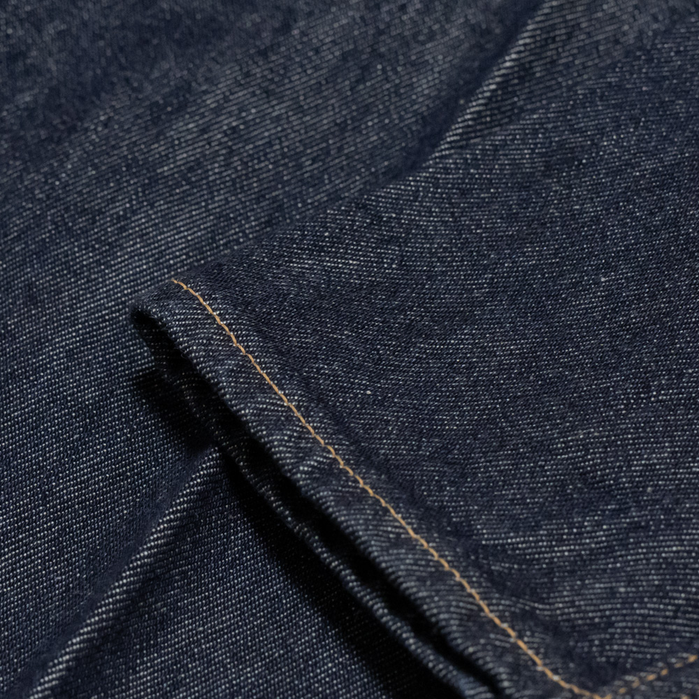素材は、何度洗い込んでも生デニムのようなパリッとした風合いを保てるデニムを目指し、一から開発したブランドオリジナルの生地を使用しています。縦糸には、ピュアインディゴでロープ染めしたムラ糸を極限まで強撚し使用しており、シャリ感のあるドライな質感と、自然な弾力のあるナチュラルストレッチを備えた、他にはない独自の風合いが特徴です。