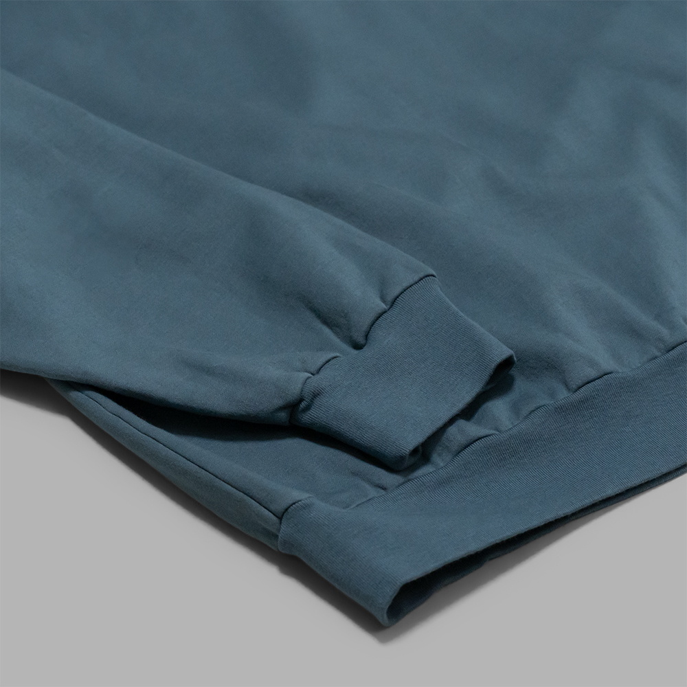 超長綿の極細番手の糸を使用し、希少な編み機で超ハイゲージに編み立てたスウェット素材です。特殊な加工により表面を微細な起毛させ、その後、裏面を最大限に起毛させています。独特で軽くもっちりとした弾力があり、美しい光沢が特徴の素材です。