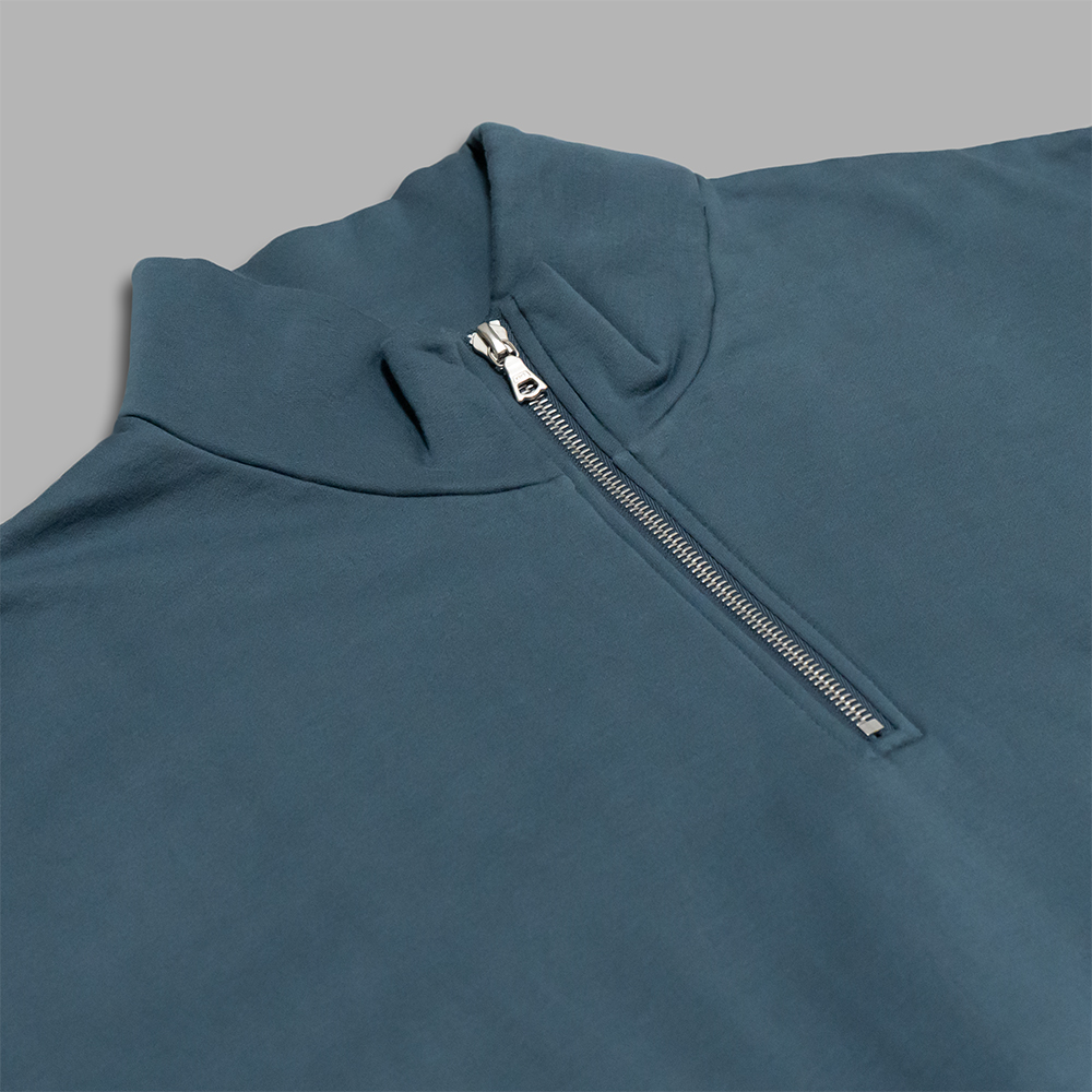 襟元のハーフジップがポイントになり、単体であわせた際の見栄えが良いだけではなく、インナーとしても重宝します。また、スウェットの中では薄手の生地が使用されているため、夏場を除く3シーズンに着用できる汎用性の高さも備えています。