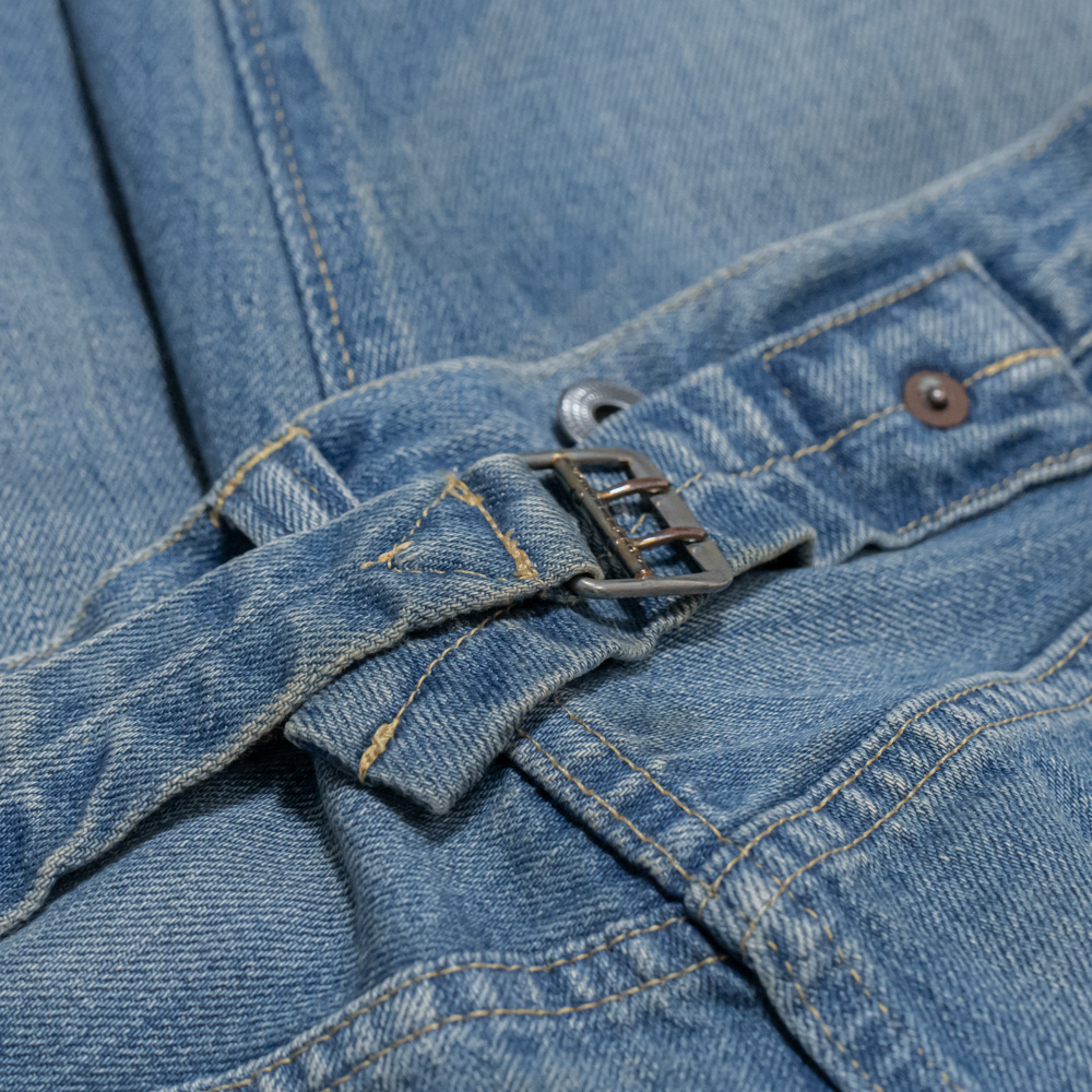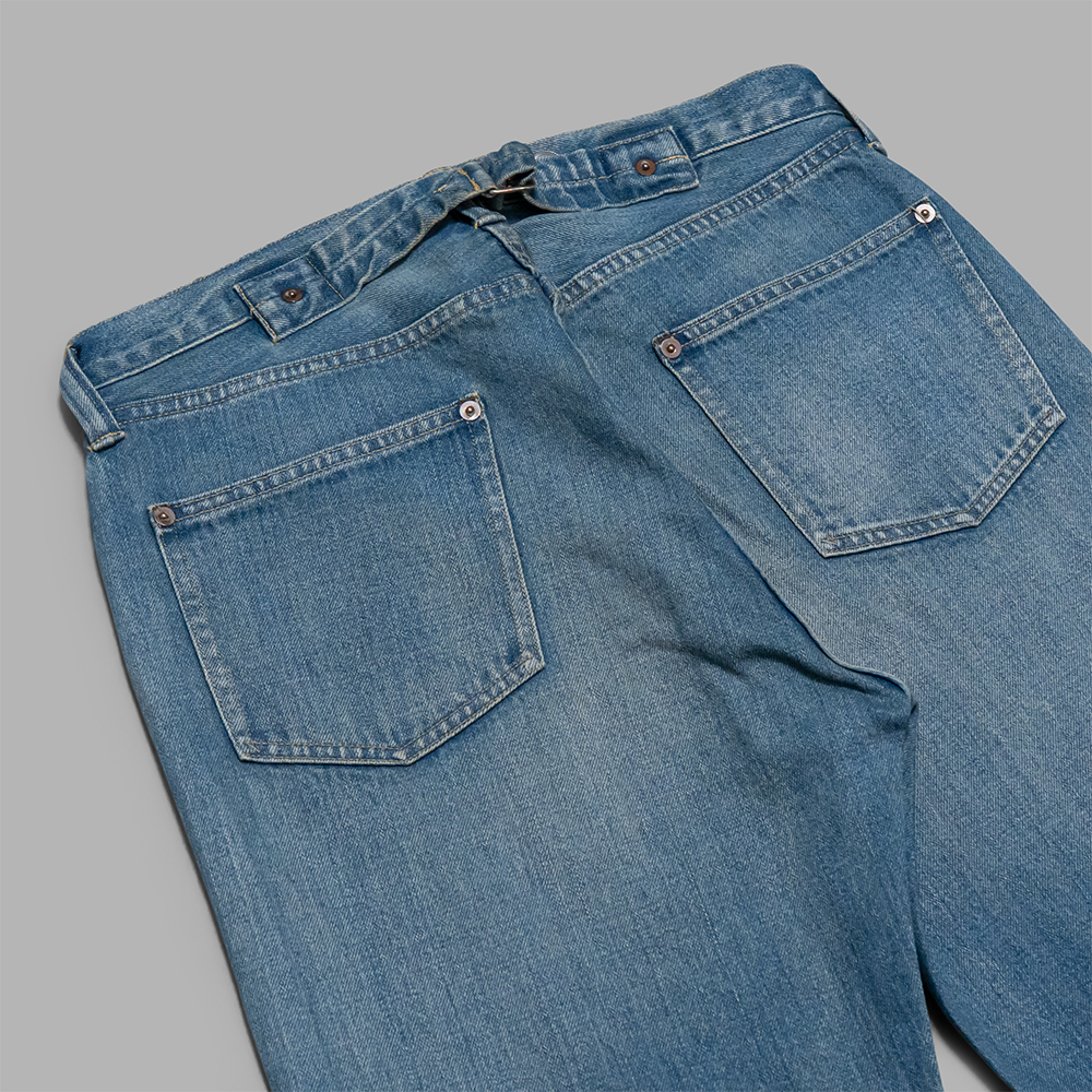 デザインのベースは1930年代頃のモデルで、シンチバック、サスペンダーボタン、剥き出しのリベットなどが特徴です。型はやや太めの弱テーパードで、当時のシルエットを再現しつつ、浅めの股上を僅かに深くし、尻ぐりのカーブを形状変更し、尻のくい込みを改善することで、履きやすさを追求しています。