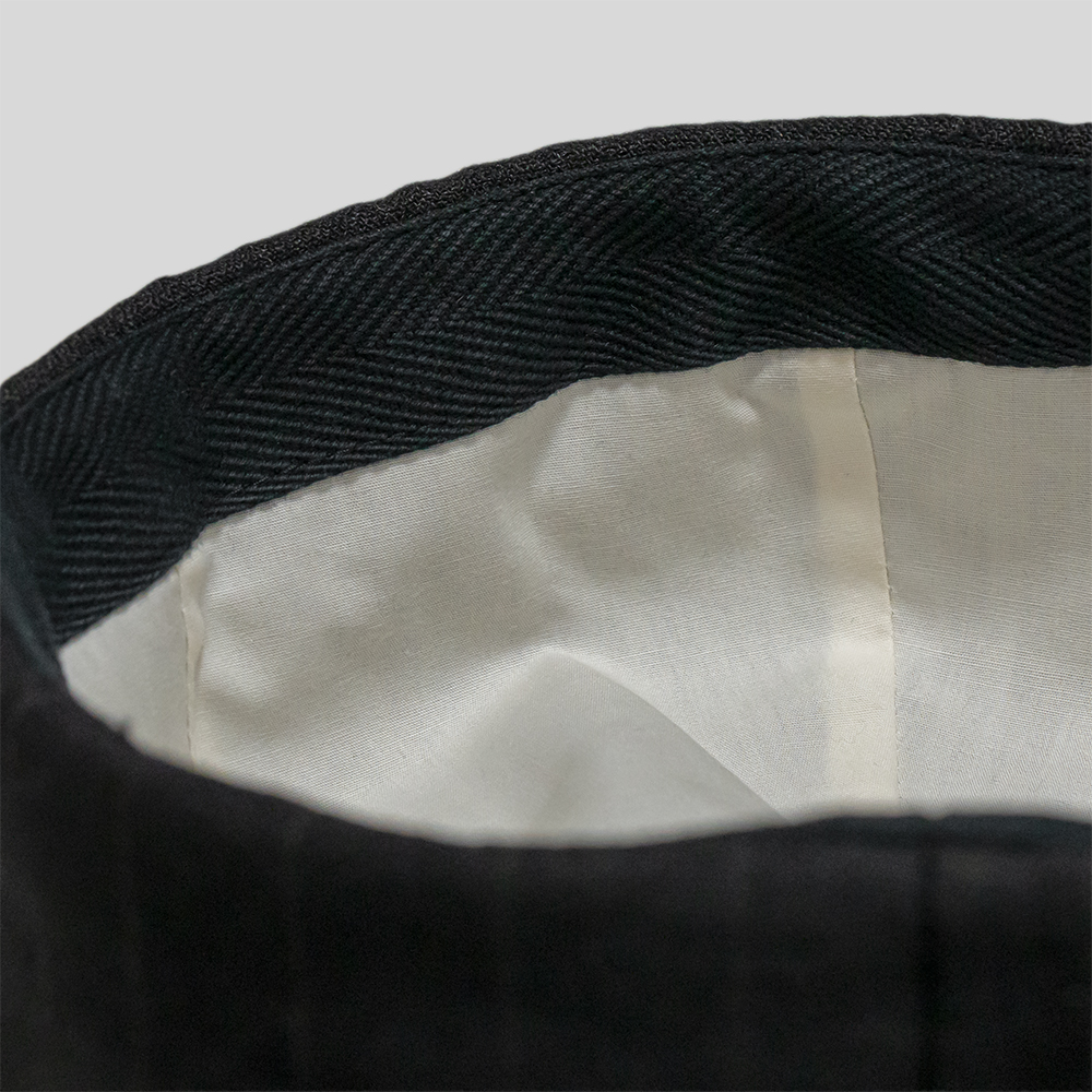 型は立体的なパターンによるフィッシャーマンキャップです。ライニングにはキュプラ素材を使用しながら、手洗い可能な仕様にしています。