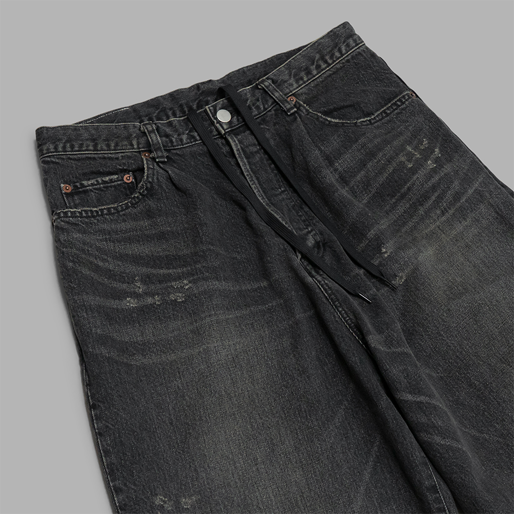 型は、股上を深くとった独特なワイドシルエットが特徴のバギーシルエットです。前立てはボタンフライで、ウエストの後ろ側に付く革パッチには、水洗いによる劣化が少ないフェイクレザーを使用しています。また、ウエスト内側はドローコードが通り、イージー仕様での着用も可能です。