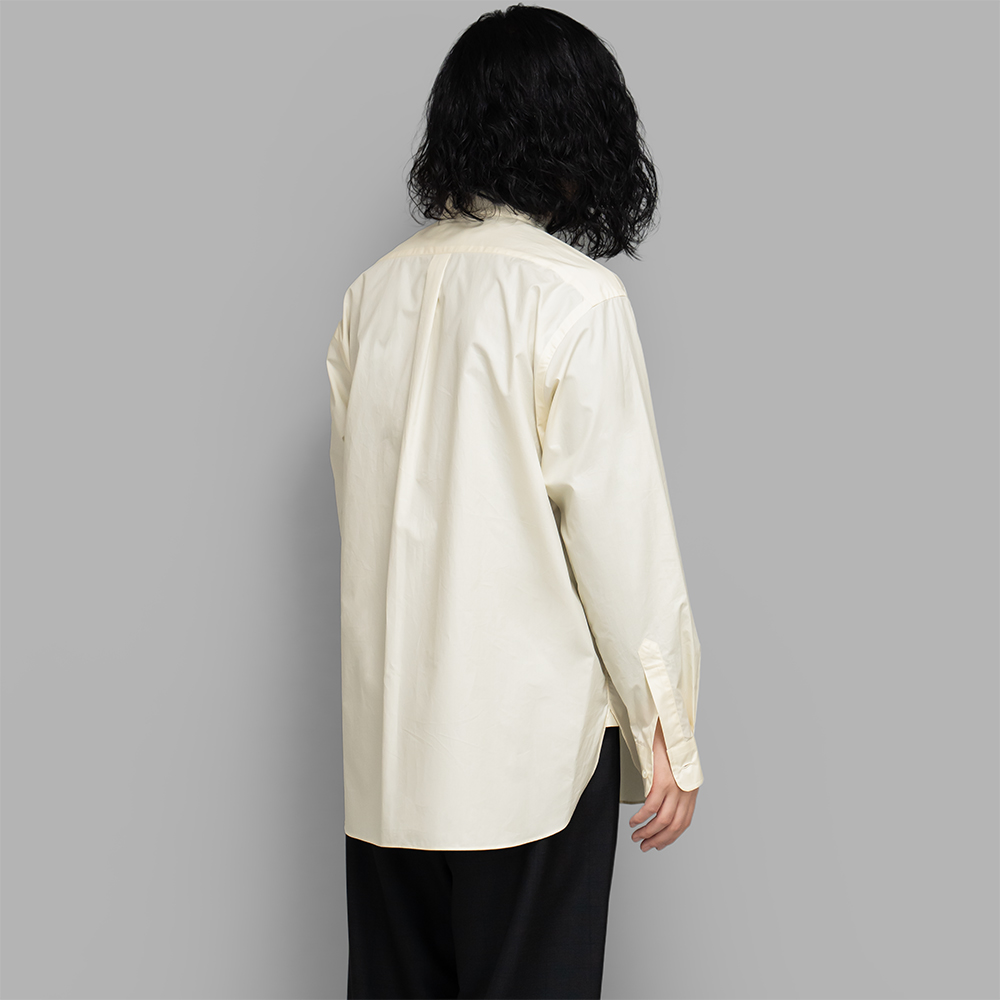 型は、全体的に程よくリラックス感のあるサイズバランスで製作されたシンプルなレギュラーカラーシャツです。VINTAGEのドレスシャツのディテールを採用し、ミニマルでモダンな方向性で製作されています。