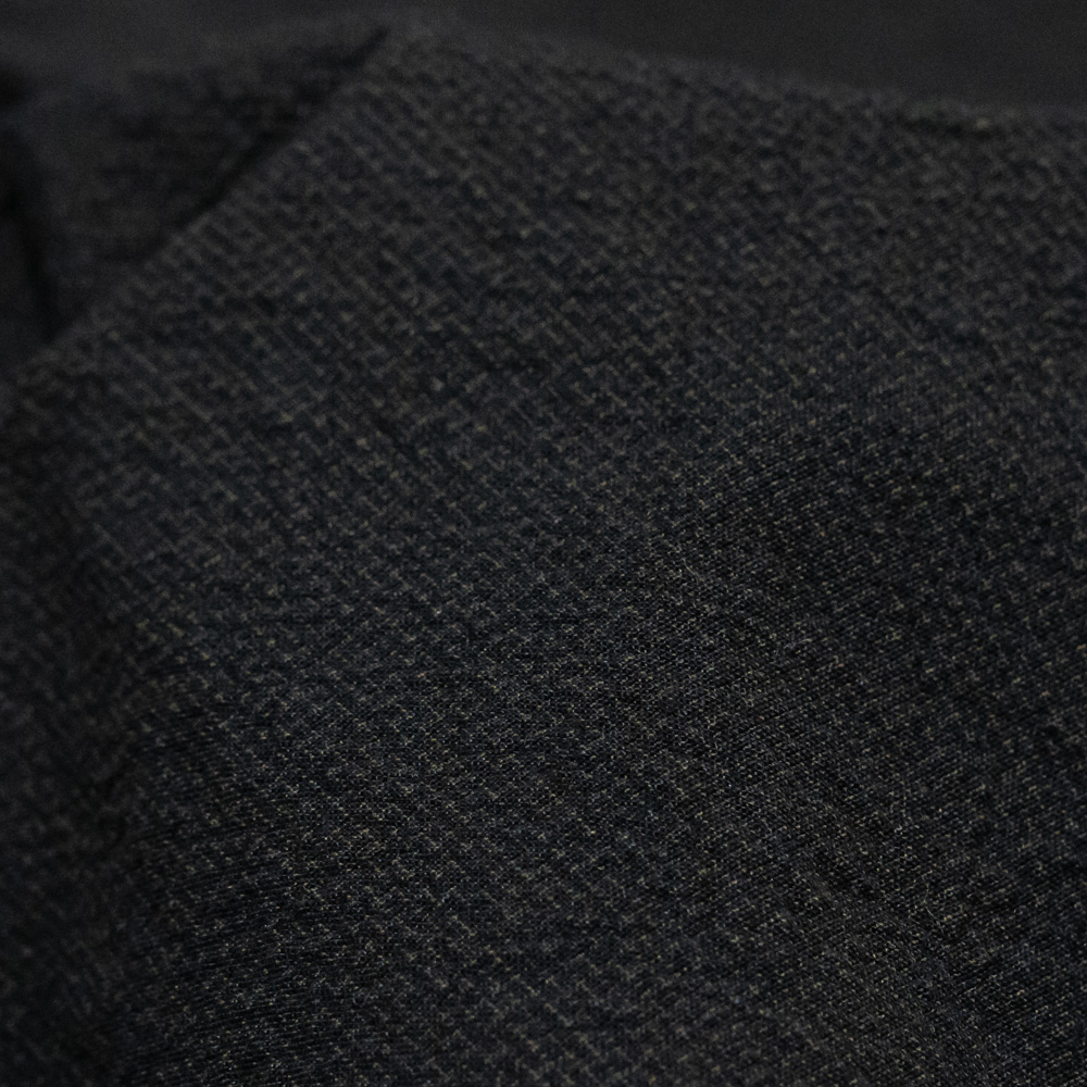 イタリアのテキスタイルメーカーが手がけるコットンとラミー素材をベースとした生地を使用しており、適度にハリ感のあるドライなタッチに仕上げています。細かな格子柄のようにも見える糸使いと凹凸感のある独特の風合いも魅力の1つです。